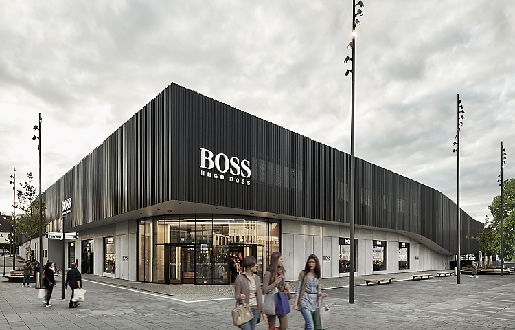 Mit seinen 5.000 Quadratmetern Verkaufsfläche ist das neue Outlet nicht nur das größte des Konzerns in Deutschland, sondern weltweit. Allein die Fassade ist Blickfang und Anziehungspunkt für die Besucher: Den historischen Bezug zu ihrem städtebaulichen Kontext aufnehmend, umgarnt die dunkle Fassade des Obergeschosses das Gebäude und umhüllt es sanft. Gleich einer Stoffbahn verbindet es die ehemalige Stofffabrik mit der Modewelt, die Produktqualität mit dem Brand-Lifestyle, die Fassade mit dem Interieur des Stores. Gleichzeitig bricht die unterschiedlich gekantete Blechfassade durch ihre vertikale Ausrichtung die extreme Horizontalität des Gebäudes. Die weiche Form der umgebenden Landschaft wird als Element der Gegenläufigkeit in die Architektur aufgenommen und akzentuiert den Gebäudering. Durch sanfte Amplituden wird die Sichtbetonfassade im Erdgeschoss so mittels Schaufenster, Medienwände, Ein- und Ausgang sowie dem Bistro mit Terrasse unterbrochen.