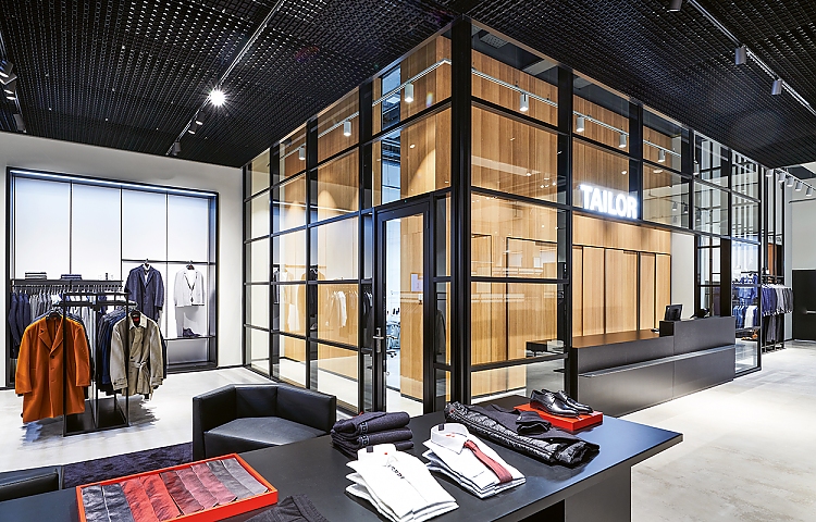 Den umfassenden Service von Hugo Boss adäquat zum Ausdruck bringend, wurden in den Kabinen Touchscreens integriert, über die beispielsweise Mitarbeiter für Hilfe oder Beratung gerufen werden können. Ohne auf ein Face-to-face mit dem Kunden verzichten zu müssen, ergänzen digitale Elemente auf diese Weise die individuelle Beratung eines jeden Kunden. Zusätzlich können die Besucher im Tailor-Bereich ihre Wunschware nicht nur anpassen lassen, sondern auch einen Eindruck davon bekommen, mit welcher Kunstfertigkeit die Hugo Boss Mode maßgeschneidert wird.