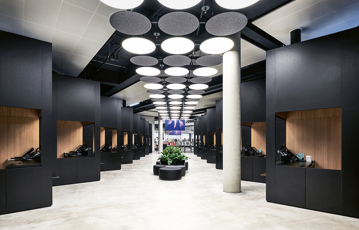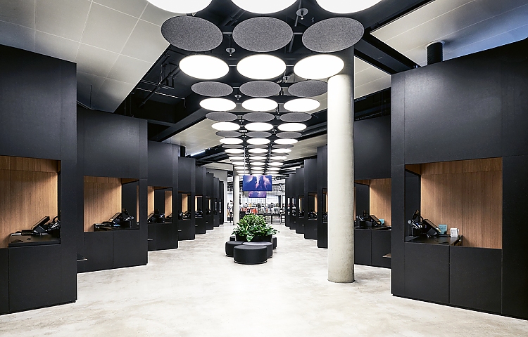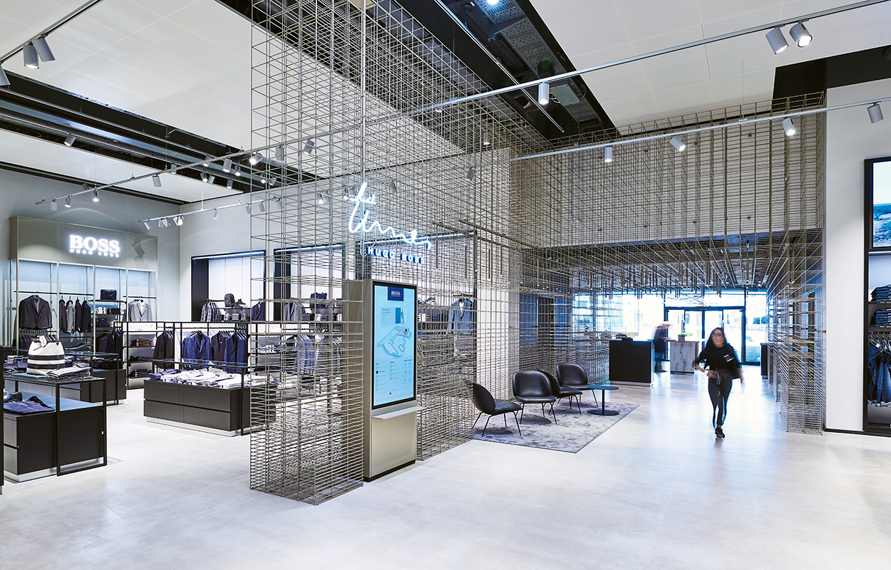 Das Storekonzept folgt dem Prinzip der Brand-Spaces, das heißt, die unterschiedlichen Marken von Hugo Boss werden in eigenständigen Bereichen mit individuellem Charakter im Cross-Merchandising-Stil inszeniert. Bei der Gestaltung wurde auf einen geringen Rückbauaufwand geachtet. Eingesetzt wurden zertifizierte naturbelassene oder rezyklierte Materialien wie Eiche oder Metall. Element in Champagnertönen spiegeln das schlichte, aber hochwertige Design der Marke wider. Dem durchgehenden grauen Estrichboden wird in den Brand-Spaces ein Terrazzoboden hinzugefügt. Mesh-Wände und Screens, die die jeweilige Markenwelt digital zum Ausdruck bringen, unterstützen die Markierung der Bereiche. Zahlreiche Konstellationen wurden im Voraus simuliert.
