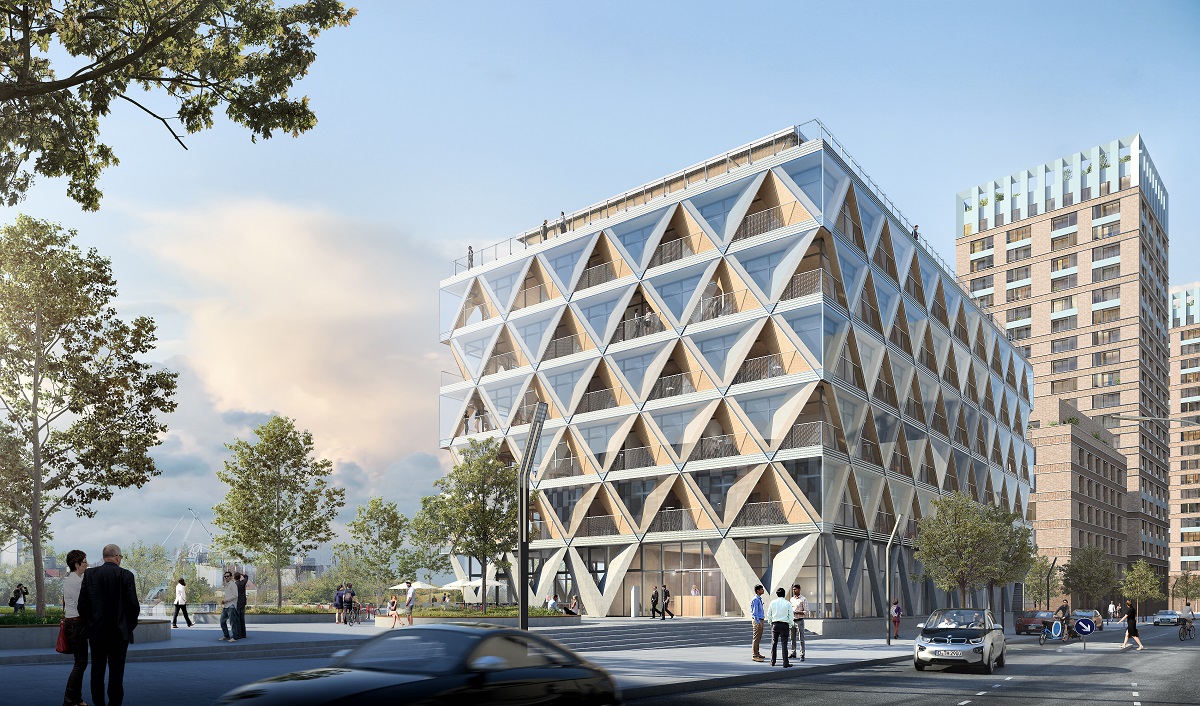 Markant ist die Holzwabenfassade, die auch die Innenarchitektur des Gebäudes konturiert. | Visualisierung: Interboden / HPP Architekten