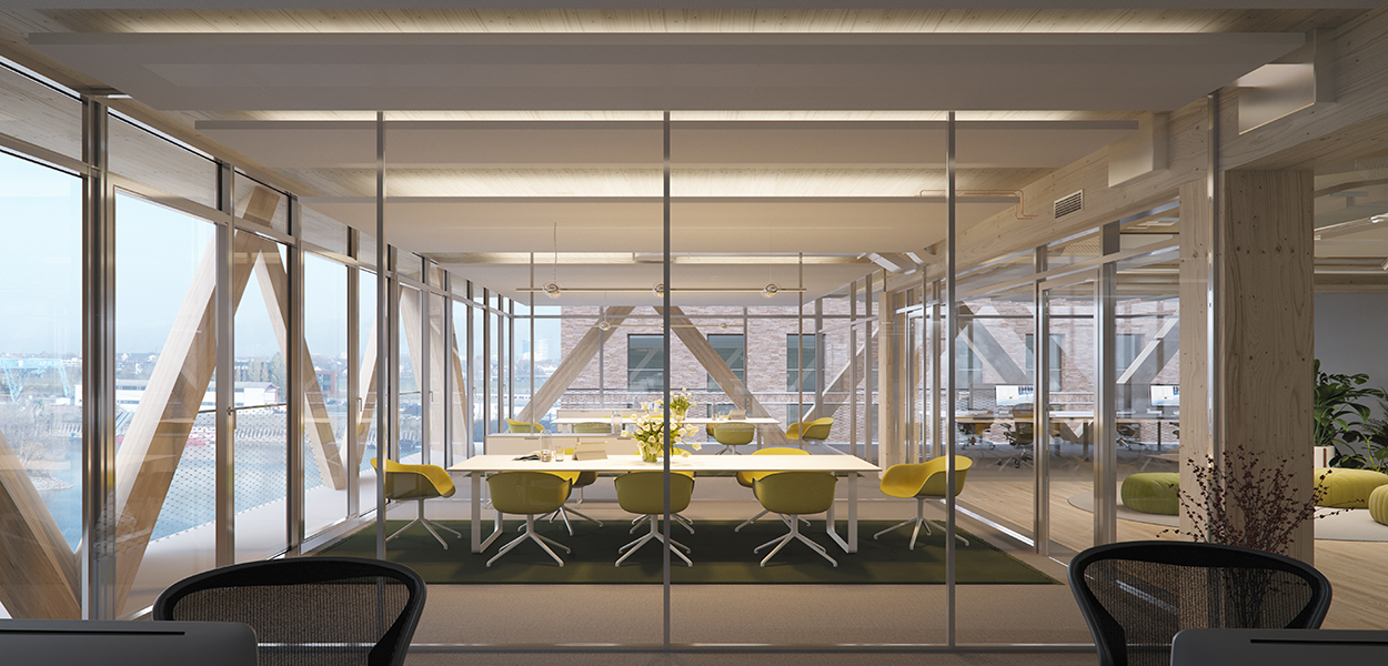 Das kommt auf die Ausgestaltung der Flächen und Fassaden an. Im Vergleich zu einem klassischen Betongebäude ist das Material sicherlich auf kurze Sicht teurer. So ist auch eine Holzdecke teurer als das Pendant aus Beton. Jedoch lassen sich die Materialien ja wiederverwenden und in den Materialkreislauf zurückspielen, was bei Beton nur mit extrem hohem Aufwand möglich ist. Wenn man beispielsweise Klinker an der Fassade oder andere Details im Innenraum verbaut, ist die Holzalternative auch nicht teurer. Am Ende ist es immer eine Frage der Detailliebe und des Verwendungszwecks. An einer so exponierten Lage im Düsseldorfer Medienhafen hätten wir auch kein 0815-Bürogebäude aus Beton erstellt.