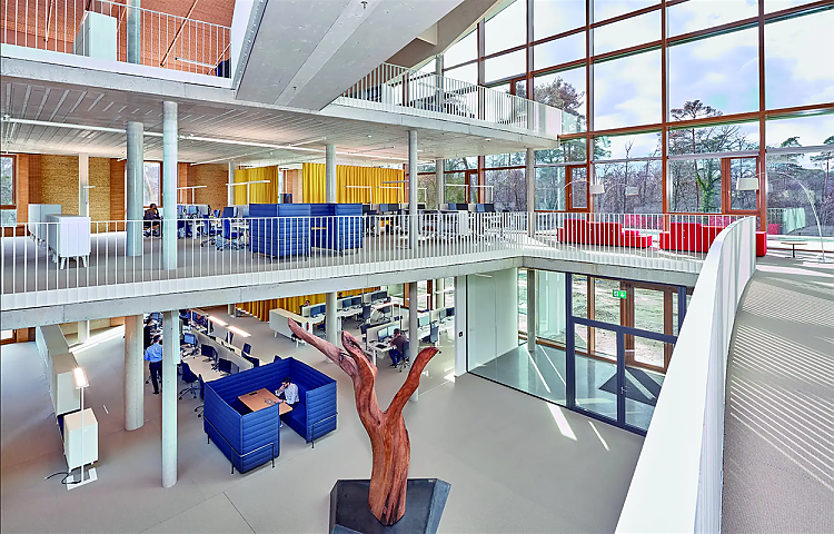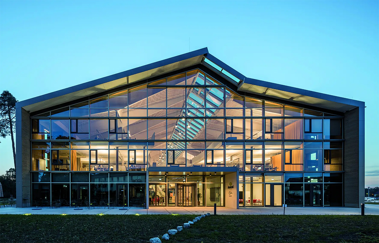 asymmetrischen Dachfirst kann das Tageslicht auf allen Stockwerken voll ausgeschöpft werden. Für seine ressourcenschonende Bauweise erhielt das Lowtech-Gebäude mit sehr guten Ökobilanz den Deutschen Nachhaltigkeitspreis 2020 in der Kategorie "Architektur".