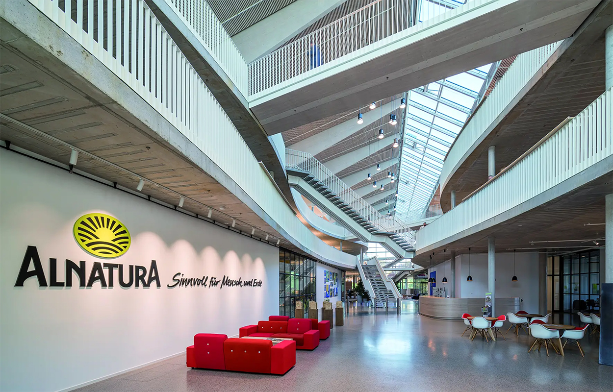 Die Alnatura Arbeitswelt in Darmstadt ist das größte Bürogebäude mit Stampflehmfassade und integrierter geothermischer Wandheizung in Europa. Das klimaneutrale, natürlich belichtete und belüftete Gebäude verfügt über 13.500 m² Bruttogeschossfläche, ist als offene Bürolandschaft für 500 Mitarbeiter konzipiert und perspektivisch erweiterbar. Das Baumaterial Lehm prägt sowohl die äußere Gestalt als auch die Innenarchitektur, die als offene Arbeitslandschaft in einem einzigen, sich über mehrere Stockwerke entwickelnden Raum konzipiert ist. Dank der großzügigen Raumhöhe und der lichtoptimierten Gebäudegeometrie mit einem offenen,