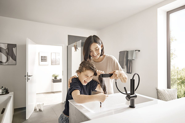 "Fintoris" – Der Waschtisch wird schnell zum Dreh- und Angelpunkt alltäglicher Aktivitäten – sei es das schnelle Haarewaschen oder das Befüllen von hohen Gefäßen. Dafür bietet die neue Armaturenlinie „Finoris" mit ihrer Variante „Flex" von Hansgrohe genügend Bewegungsfreiraum und erleichtert routinierte Handgriffe. Der ausziehbare Armaturenkopf macht es möglich. Dabei können mit nur einem Handgriff und per Knopfdruck zwei Strahlarten – der sanfte „PowderRain"-Brausestrahl oder der fülligere Laminar-Strahl – eingestellt werden, wobei beide nicht mehr als 5 Liter Wasser pro Minute verbrauchen. Und nach jeder Nutzung gleitet die Brause durch eine magnetische Rückzugsunterstützung sanft in ihre Ausgangsposition zurück. Erhältlich ist „Finoris" in Chrom, Mattschwarz oder Mattweiß.