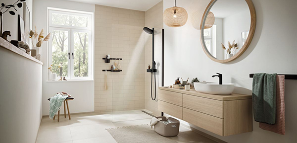 Für mehr Sicherheit sorgt eine intelligente Wasserführung im Inneren des Thermostats. So wird das Gehäuse der Armatur nicht durch das zugeführte Warmwasser erhitzt und schmerzhafte Kontakte mit heißen Oberflächen gehören damit der Vergangenheit an. Das flache Profil der Showerpipe wirkt dezent und schafft zudem mehr Bewegungsfreiraum beim Duschen. Die hansgrohe Pulsify Dusche besticht durch ein modernes augenfälliges Design. Mit abgerundeten, pflegeleichten Formen ist sie ein Blickfänger in unterschiedlichen Badambienten. Mit den drei verfügbaren Oberflächen Chrom, Mattschwarz und Mattweiß lässt sich hansgrohe Pulsify ideal mit ergänzenden Produkten an Waschtisch und Wanne kombinieren, insbesondere mit der hansgrohe Vivenis Armaturenlinie. Ist weiterer Stauraum von Nöten, bietet die Marke hansgrohe auch die im gleichen Designstil gestaltete Accessoires-Linie WallStoris. Dieses flexible Aufbewahrungssystem bietet Ablagekörbe und Haken, die direkt auf eine Wandstange geklickt werden und modular kombinierbar sind.
