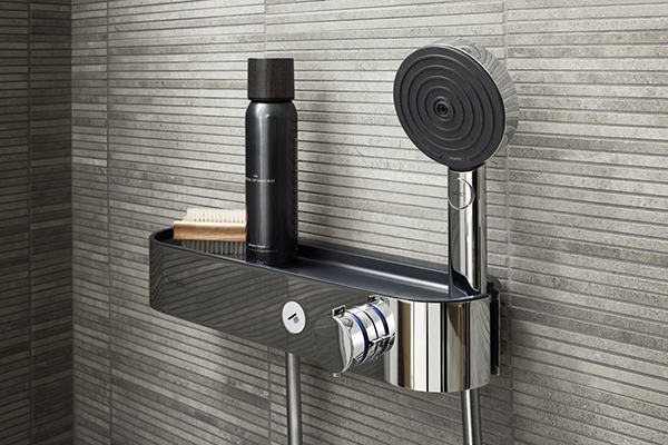 Unter der 260 mm großen Kopfbrause der "Pulsify Showerpipe" mit verstellbarem Winkel lässt es sich nach einem stressigen Arbeitstag ausgiebig entspannen. Direkt an der Armatur werden die Strahlarten per einfachem Knopfdruck variiert oder auf die Handbrause umgestellt. Im ShowerTablet Thermostat sind jedoch nicht nur die Steuerung für Temperatur und Wasservolumen integriert. Die über 40 cm große Ablagefläche dient gleichzeitig als Stauraum für Duschgel, Shampoo und quasi auch als "Parkplatz" für die Handbrause.