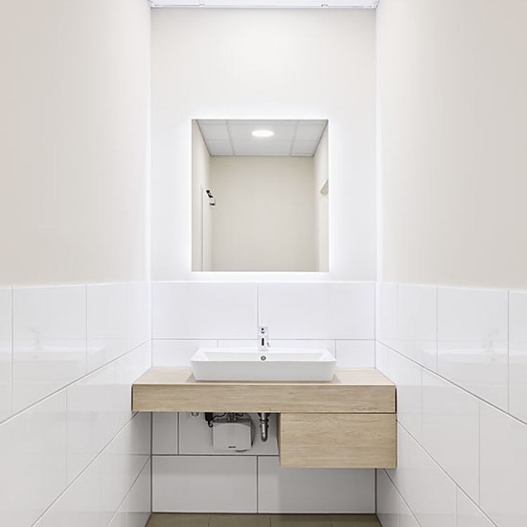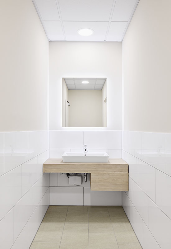 Das Planungsteam für Bestandsentwicklung der SWD legte den Ausstattungsstandard der Sanitärbereiche selbst fest: Die Gestaltung der Sanitärräume sollte stilistisch an eine designorientierte, moderne Büroumgebung anschließen und dabei hohen Hygieneanforderungen entsprechen. Unterstützt wurde das Team um Nicole Rosendahl bei der Entwicklung eines ansprechenden Interiordesigns von Ideal Standard als einem Komplettanbieter im Sanitärbereich.