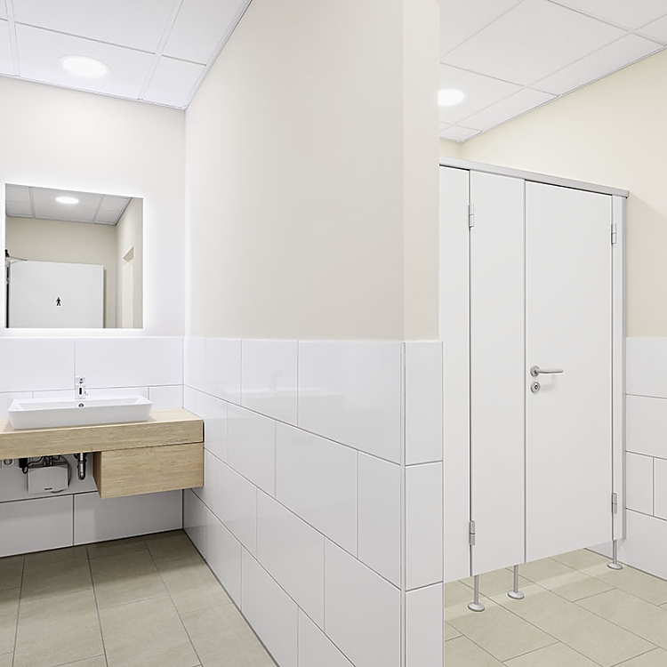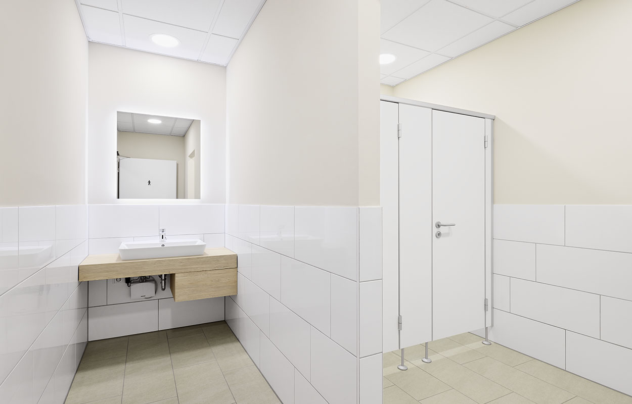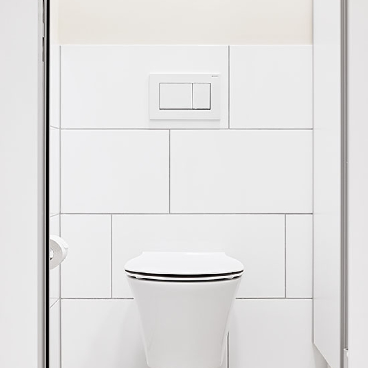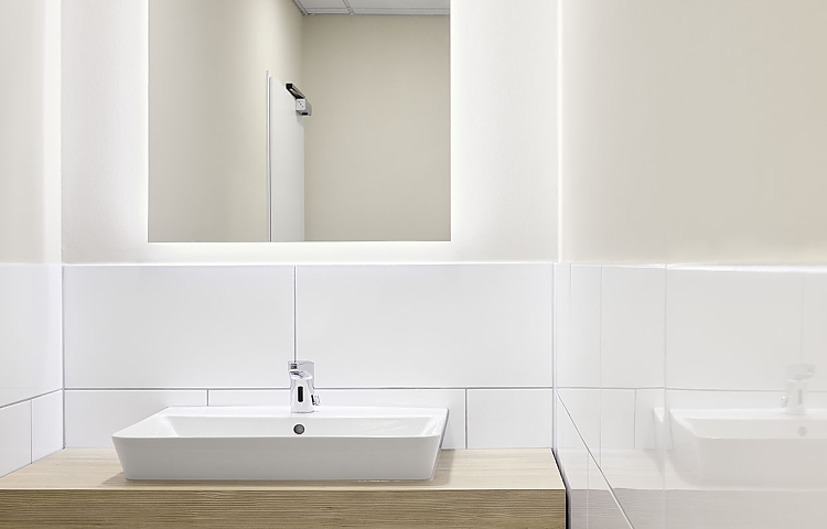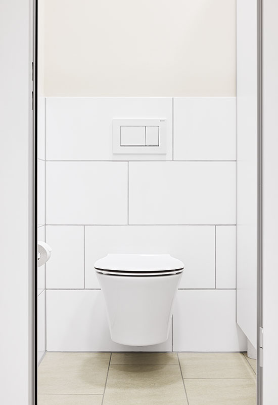Der warme, cremige Sandton der Bodenfliesen und Wandfarbe gibt die freundliche Grundstimmung der Sanitärräume vor. Die Benutzer sollen sich hier wohlfühlen. Vor diesem Hintergrund setzt sich die filigrane und Leichtigkeit vermittelnde Formensprache der in Weiß gehaltenen "Connect Air"-Keramik, aus der WCs und Waschtische gefertigt sind, dezent ab. Die Keramikoberfläche ist mit der schmutz- und wasserabweisender "Ideal Plus"-Beschichtung veredelt und hält auch intensiv betriebenen Reinigungsroutinen stand.
