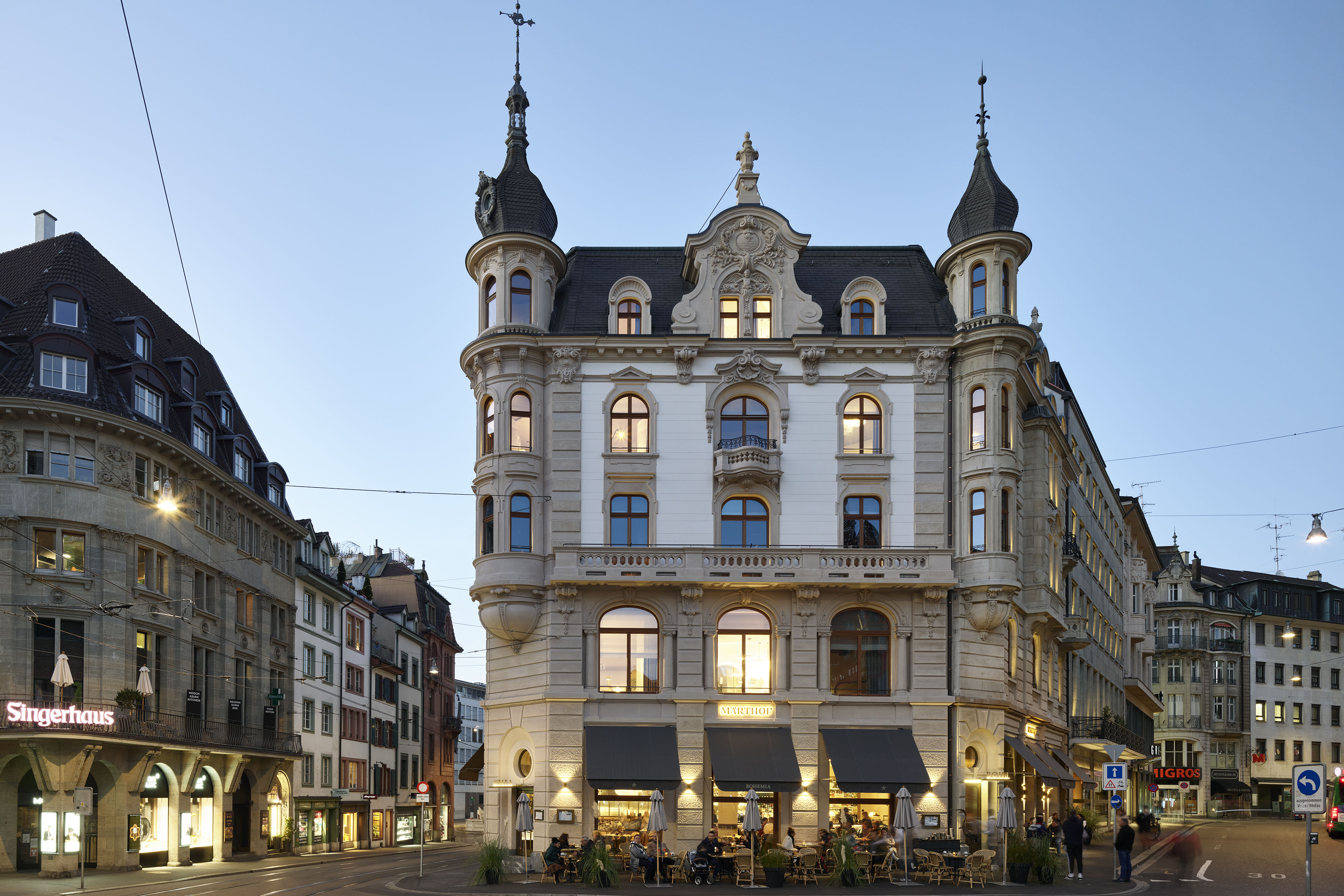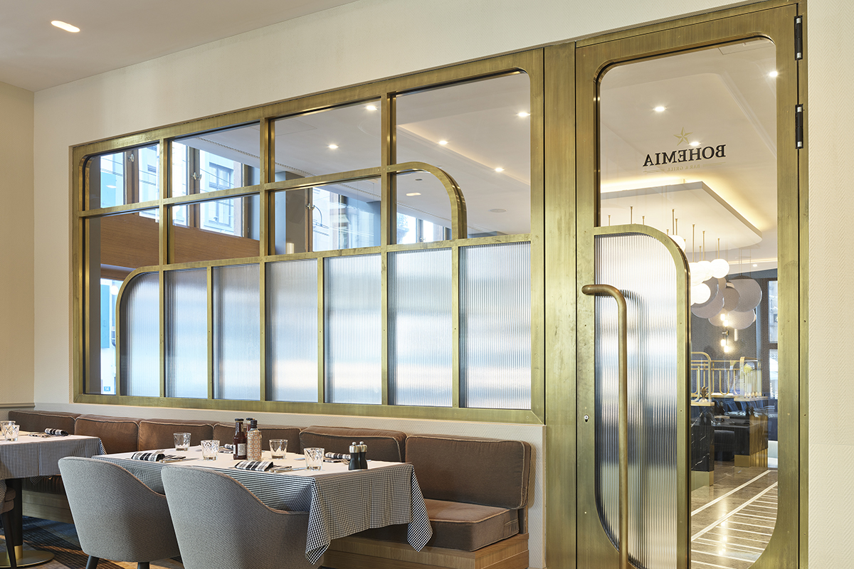 Nach 18-monatiger Umbauzeit wurde das Restaurant Bohemia Basel im Rahmen der Gesamteröffnung des komplett renovierten Gebäudes Ende Juli eingeweiht. Der Restaurantbereich belegt neben Front Office und Lobby des Hotels das Erdgeschoss des Märthof und ist damit der direkte Anknüpfungsort an die lokale Bevölkerung. An diese richtet sich das Bohemia Basel auch ganz explizit. Inspiriert von den Bohèmes des 19. Jahrhunderts steht das Restaurant für Offenheit, Großzügigkeit und Vielfalt – ein Ort für alle, ein Treffpunkt für Basel und ein temporäres Zuhause für die Hotelgäste. Das zeigt sich einerseits im gastronomischen Angebot: Von früh bis spät, vom einfachen Getränk bis zum ausgedehnten Menü ist im Restaurant Bohemia Basel alles möglich.