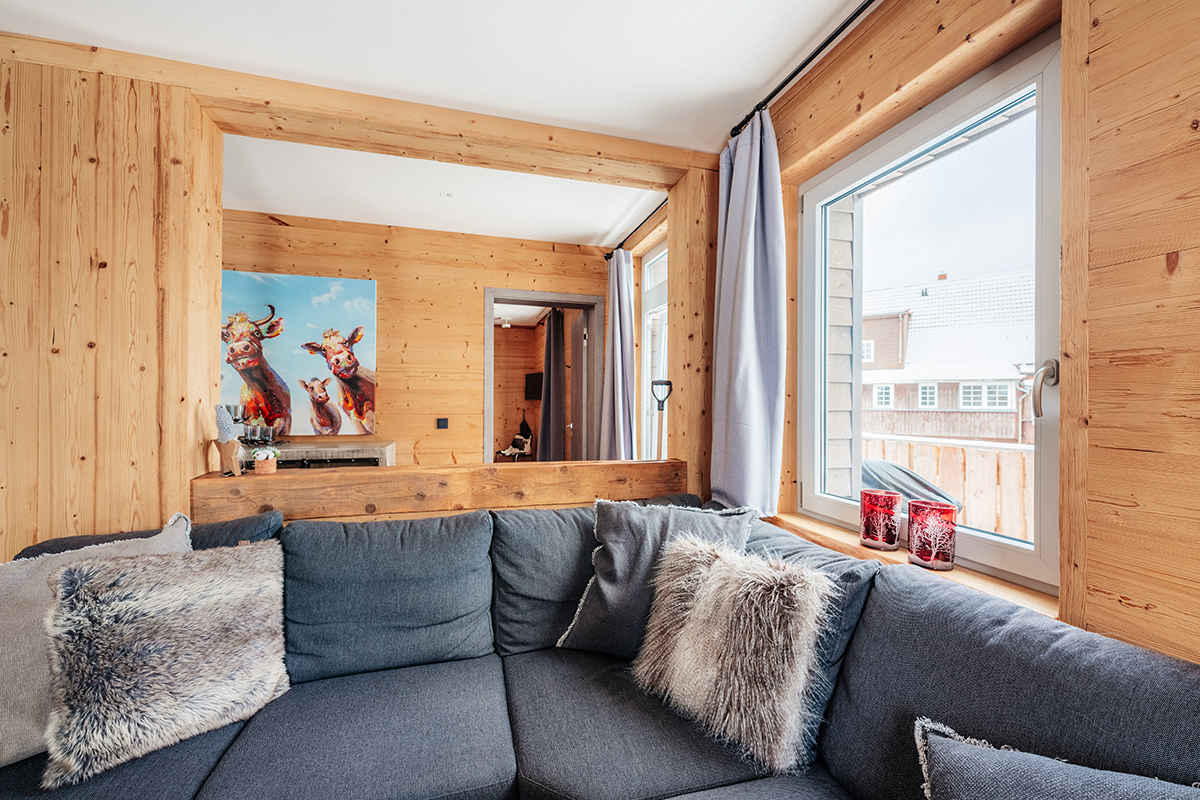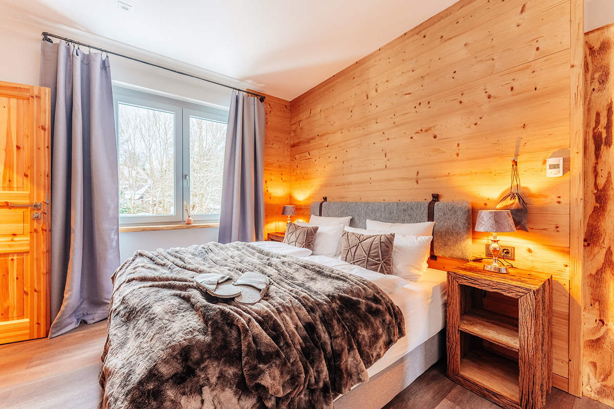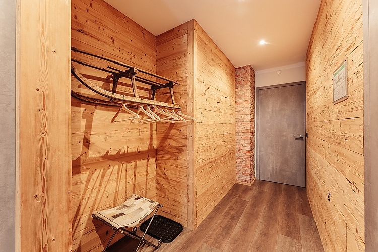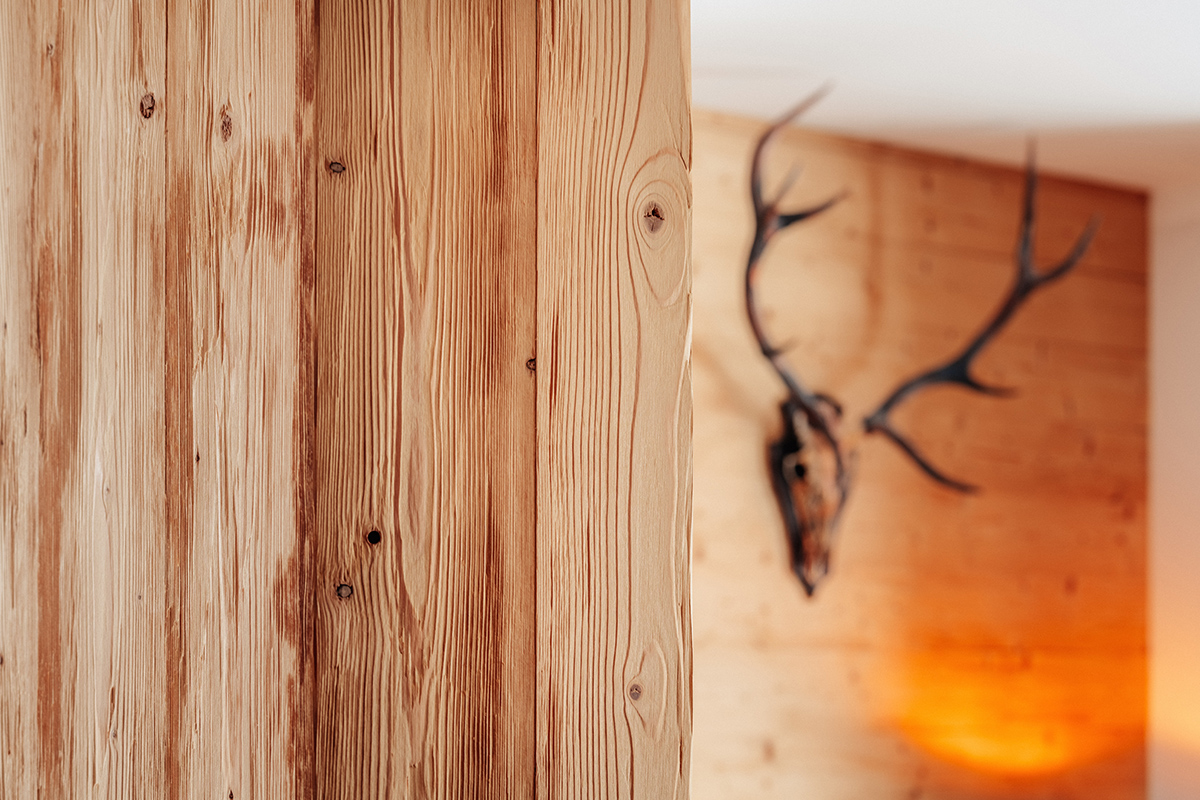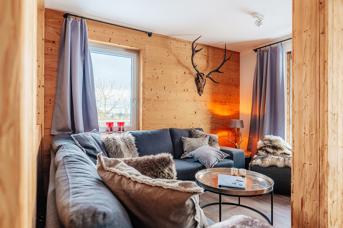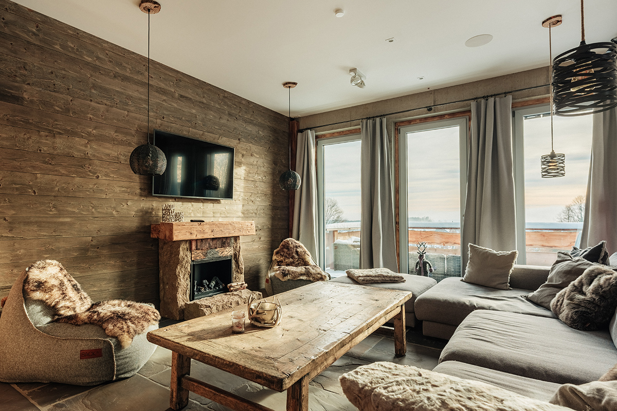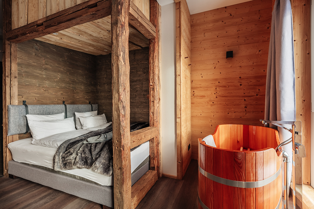 Zu jedem der individuell eingerichteten Apartments gehört eine Terrasse sowie Sauna oder Hot Tub. Die Ausstattung punktet nicht nur mit einem hohen Komfort, sondern auch mit einem Kamin und vielen kreativen Details. Zum Beispiel sorgen hölzerne Waschtische und umfunktionierte Schlitten als Garderobenstange für ein modernes Hütten-Flair. Vollholzprofile mit der Aura von Jahrhunderten – die in den Innenräumen eingesetzten Holzoberflächen sind gehackt und unterstreichen den rustikalen Stil gekonnt. Das Prinzip dieser Bearbeitung wendeten Zimmerer schon vor Jahrtausenden an, um Balken zu behauen. Dezente, naturnahe und warme Grau- bis Brauntöne runden das Bild von Ursprünglichkeit in ihrer reinsten Form ab und unterstreichen den alpinen Charme der Apartments.