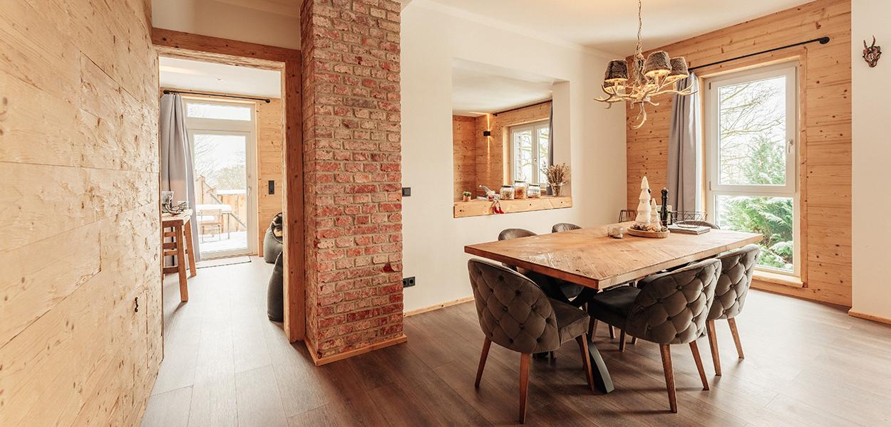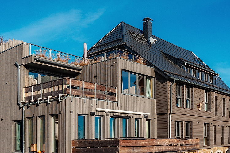 "Wir haben uns im Urlaub sofort in den Ort und das 100 Jahre alte Gebäude verliebt. Mit dem Ziel, das historische Ambiente wieder zum Vorschein zu bringen und einem interessanten kreativen Konzept ist daraus die WLodgeOne mit fünf cosy Apartments entstanden", erklären die Bauherren Esther und Peter de Wit. "Dabei wurde mit einer Kernsanierung kein Stein auf dem anderen gelassen und das alte Fachwerk wieder freigelegt. Zudem hat ein Anbau mehr Raum geschaffen. Um den Apartments einen natürlichen, rustikalen Charakter zu geben, haben wir alle Innenwände mit Holz verkleiden lassen. Aber auch für die Fassadenflächen sind Vollholzprofile zum Einsatz gekommen. Wir hatten ganz besondere Vorstellungen zu diesem Werkstoff aus der Natur – sowohl in der Optik als auch in den Materialeigenschaften. Wir freuen uns, dass der Hersteller Mocopinus unsere speziellen Wünsche alle erfüllen konnte".