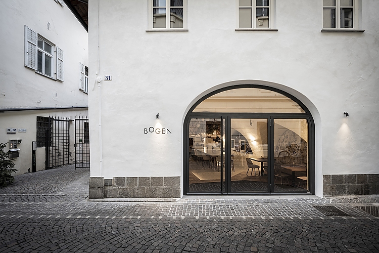 Obwohl der Raum seine markante ursprüngliche Architektur beibehielt, wurde er im Laufe der Zeit beschädigt. Familie Mayr, die heutigen Eigentümer des Gebäudes, beauftragte Noa mit der Restaurierung und der Planung des Innenraums für eine neue Nutzung: dem Bistro Bogen. Der starke Bezug zur Geschichte war bei der Definition des Projekts entscheidend: zum einen, weil das Haus unter Denkmalschutz steht, zum anderen, weil das Designteam die ursprüngliche Architektur der Bögen bestmöglich hervorheben wollte. An der Außenfassade wurde das Gebäude sorgfältig in Aschweiß neu verputzt und der Eingangsbogen vergrößert. Hier wurde ein dreiteiliger schwarzer Metallfensterrahmen mit einem essentiellen und eleganten Charakter eingebaut, der dem abgesenkten Bogen folgt und eine gute natürliche Belichtung ermöglicht.