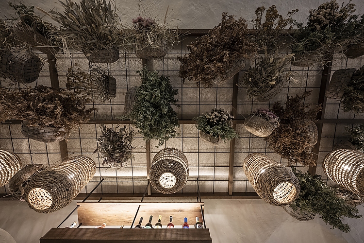 "Die mit Blumen geschmückte Decke wurde sofort zum Highlight der Inneneinrichtung. Die umgedrehten, mit Trockenblumen gefüllten Körbe sind ein suggestives Bild, das die Vergänglichkeit, aber auch die Schönheit des Lebens symbolisiert", erklärt Silvia Marzani, Innenarchitektin bei Noa.