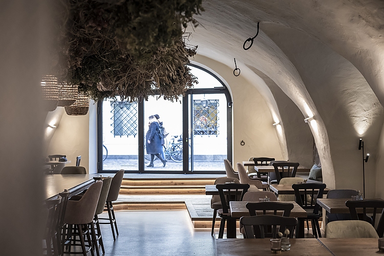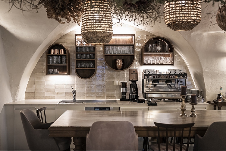 Die Gemeinschaftlichkeit der großen Tafel steht im Gegensatz zu der Intimität der kleinen Tische auf der linken Seite des Bistros, die den Blick auf die Gasse freigeben. Die Privatsphäre wird in den ersten beiden Bögen noch weiter verstärkt, die Sitzplätze sind in die Nischen eingebaut und die Wände mit einem Stoff mit elegantem Blumendruck bespannt. Die Nische, die den Raum abschließt, ist auf die gleiche Weise gestaltet. In einem ständigen Dialog zwischen Vergangenheit und Gegenwart entscheidet sich Noa dafür neue Stühlen aus Holz und Stoff mit neu lackierten Vintage-Stühlen abzuwechseln.