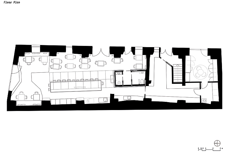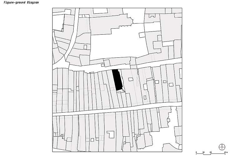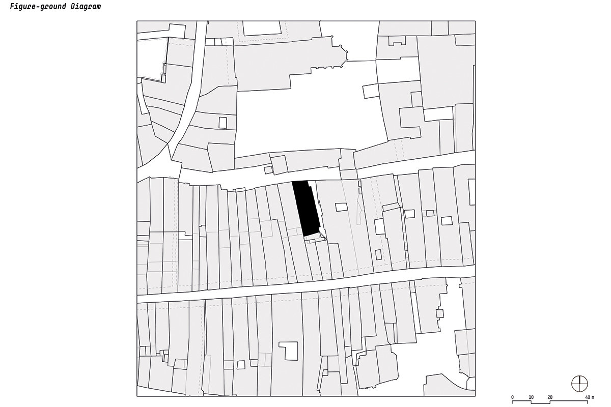 durchquert sie noch heute drei mittelalterlichen Steinbögen. Auf halber Strecke der erstmals 1498 urkundlich erwähnte Straße, die entlang des ehemaligen nördlichen Stadtgrabens verläuft, steht ein Haus, das kaum zu übersehen ist: mit nur zwei Stockwerken ist es eines der niedrigsten in der Straße. Eine Außentreppe mit offenem Gang sowie Rundbogenportale erschließen das Gebäude ostseitig und brechen die geschlossene Straßenfront. Dieses Haus ist die Kulisse für das neueste Innenarchitekturprojekt von Noa.