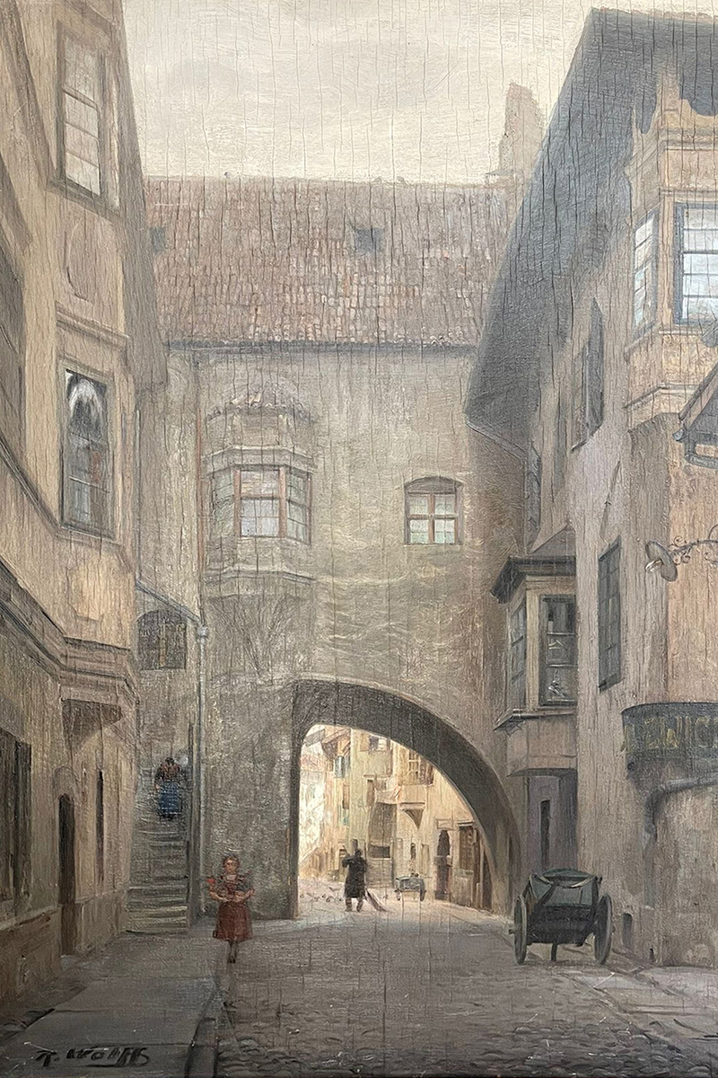 "Bei unserer Recherche über die damals so genannte Karnergasse haben wir ein Gemälde des Malers Richard Wolff über das Leben an der Wende vom 18. zum 19 Jahrhundert gefunden. Wir waren überrascht im Vordergrund dieser faszinierenden Momentaufnahme das Eingangstor zum heutigen Bistro Bogen zu sehen", erzählt Stefan Rier.
