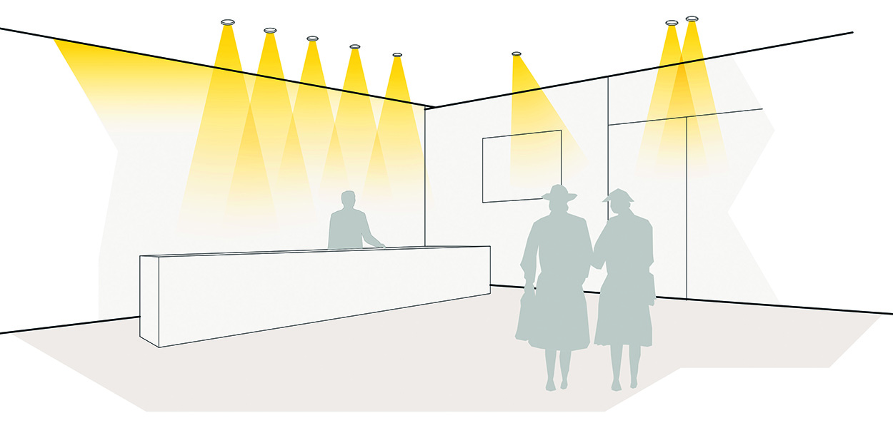 In der Lichtplanung spielt die Art der Beleuchtung eine größere Rolle als der Leuchtentypus. Anders ausgedrückt: Wichtiger als die Wahl einer speziellen Leuchte ist für ein Lichtkonzept das Licht, das diese produziert. Licht lenkt Aufmerksamkeit. Insbesondere direktes Licht erzeugt Lichtinseln, welche das Augenmerk auf sich ziehen. Direkt strahlende Pendelleuchten wie z.B. die "p.035" oder gut platzierte Downlights wie die "p.108" können so sehr subtil etwa die Rezeption als Anlaufpunkt betonen oder in der Gastronomie einzelne Tische als Rückzugsorte inszenieren. Auch Laufwege sowie Ein- und Ausgänge lassen sich mit solch einer Akzentbeleuchtung geschickt hervorheben. Wichtig ist, dass nicht gleichmäßig hell ausgeleuchtet wird: Effekte wie diese beruhen auf einem durchdachten Wechselspiel zwischen hellen und dunkleren Bereichen. Die Grundlage eines guten Lichtkonzepts ist das Zusammenspiel von Akzent- und Allgemeinbeleuchtung. Letztere sorgt für Raumübersicht und Orientierung. Mit seinem weichen und gleichmäßigen Charakter bietet sich indirektes Licht für diese Aufgabe an. Eine zeitlos-moderne Möglichkeit dafür ist die sogenannte Voutenbeleuchtung: In einer konstruktiven Fuge – meist im Übergang zwischen Decke und Wänden, manchmal auch in Bodennähe – wird eine lineare Lichtquelle eingelassen, beispielsweise die LED-Leisten "p.100" aus dem "prediger.base"-Sortiment. Sie beleuchtet den Raum über die Reflexion und betont Struktur und Architektur. Flure lassen sich so sanft illuminieren. Einen ähnlichen Effekt erzielen Lichtleisten unterhalb von Möbeln, etwa Theken oder Tresen.
