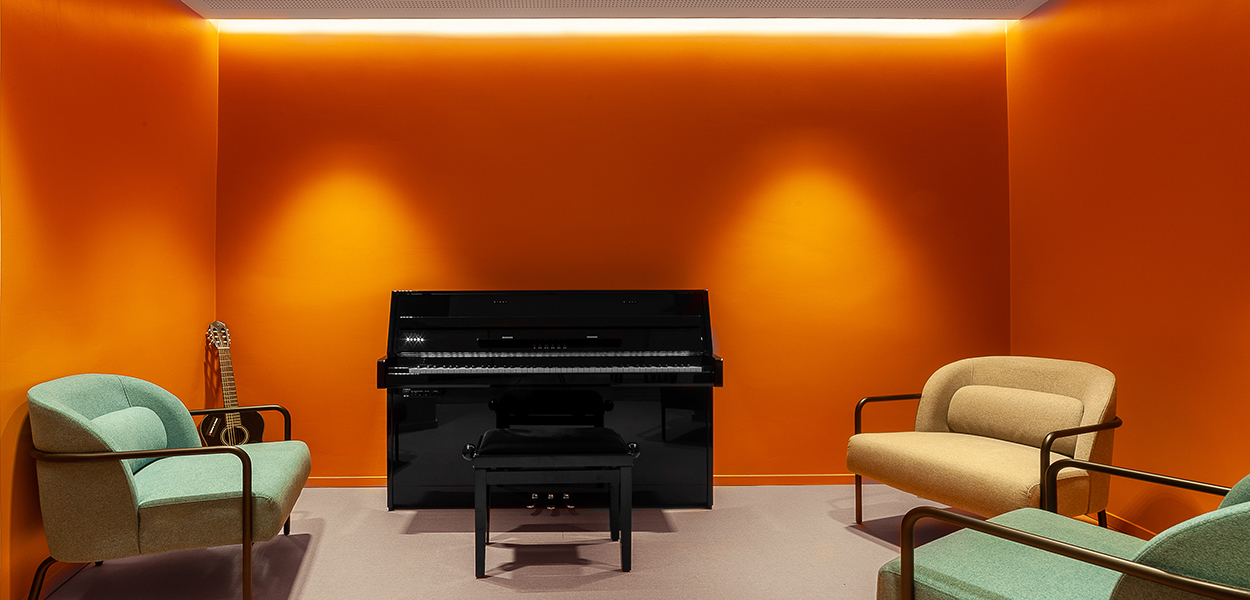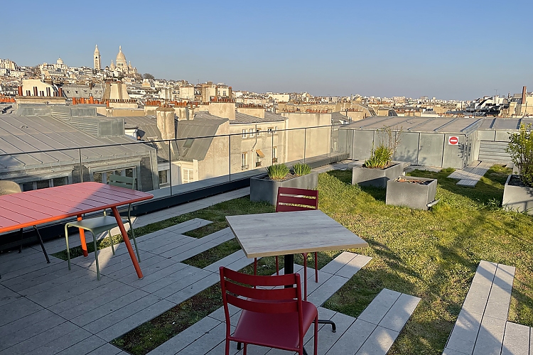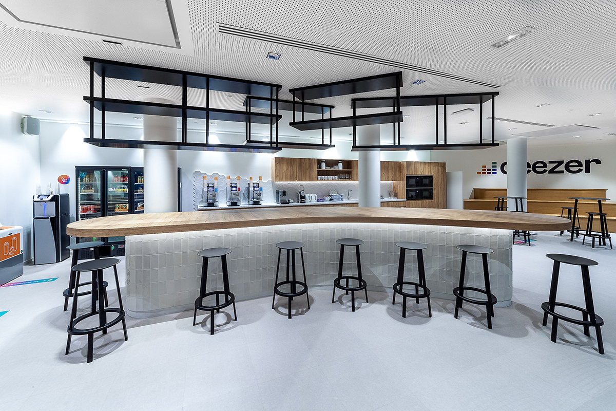 Auf der unteren Ebene des Gebäudes befindet sich ein vielseitig nutzbarer Café- und Gemeinschaftsbereich, in dem sich die Teams morgens zum Frühstück treffen, nachmittags Hackathons austragen und abends Live-Musik veranstalten können. Neben verschiedenen Bereichen für die Ruhe- und Fokus-Arbeit wurden zudem zusätzliche sanitäre Einrichtungen, Fitness- und Freizeiträume und ein Achtsamkeitsraum geschaffen. Das hauseigene Musikstudio dient sowohl als Proberaum für die von Mitarbeitenden gegründete Deezer-Band als auch für alle, die ein Instrument üben möchten. Daran angeschlossen ist auch ein komplettes Aufnahmestudio und eine Podcast-Produktions- Kabine. Von der großen Dachterrasse aus hat man einen 360-Grad-Blick auf Paris, mit Blick auf den Eiffelturm auf der einen und der Basilika Sacre Coeur auf der anderen Seite.