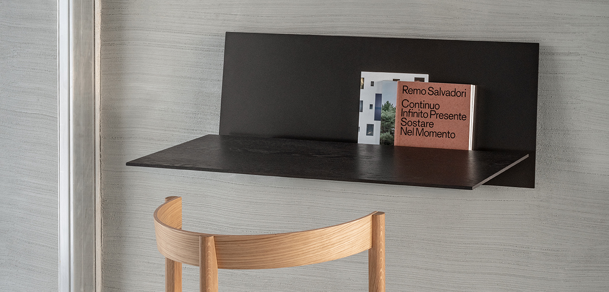 Die schräggestellte Rückwand dient als Ablage, die ausgewählte Bücher, Notizen und Objekte zu inszenieren.