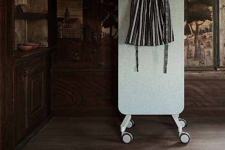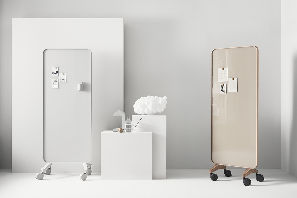 Hartes Glas trifft auf weiche Textilelemente. In Zusammenarbeit mit dem schwedischen Designstudio Halleröd und Matti Klenell entstand "Mood Fabric Mobile" – ein echter Allrounder. Besonders die Kombination aus Glas und Textil erweist sich als raffiniert in der Anwendung: Während die Glasfläche magnetisch und beschreibbar ist, kann die stoffbezogene Rückseite mit schallabsorbierender Füllung als Raumteiler mit Akustikfunktion eingesetzt werden. Ideen und Notizen können hier schnell gepinnt und festgehalten werden. Die Schreibtafel kann mit Laufrollen leicht transportiert werden. Die spezielle Form mit sanft abgerundeten Ecken ist angenehm in der Handhabung: So lassen sich alle Boards leicht drehen und bewegen.