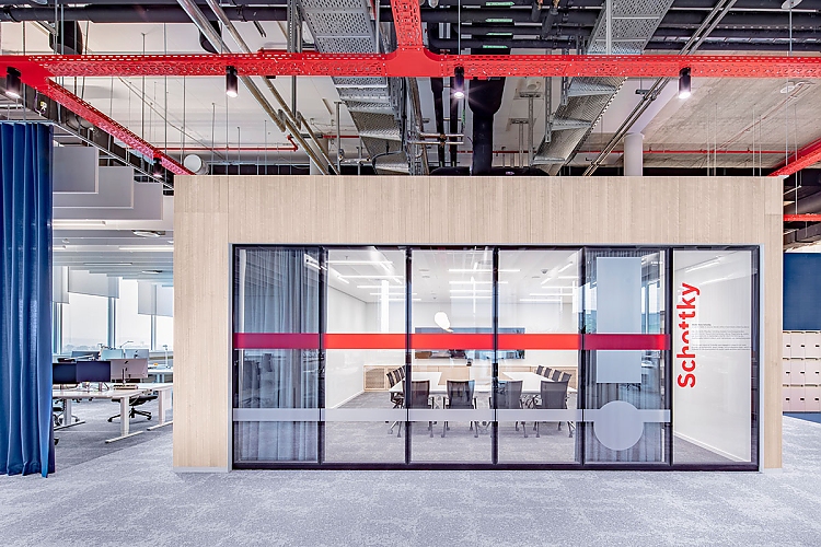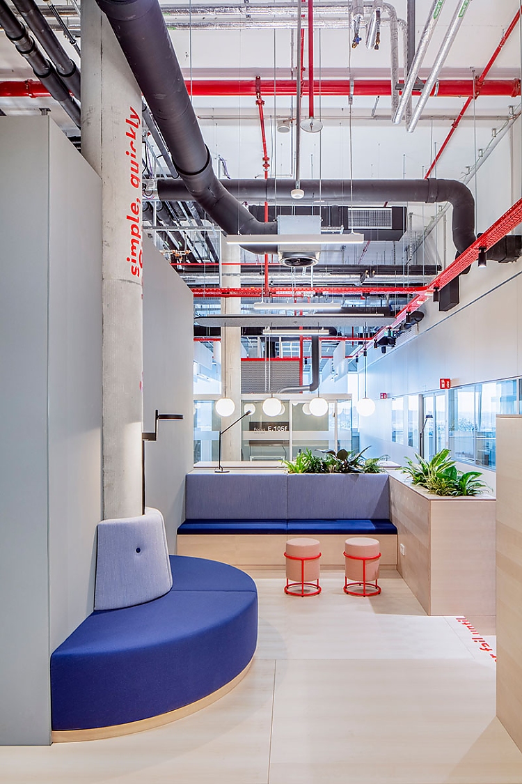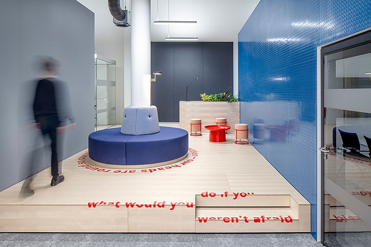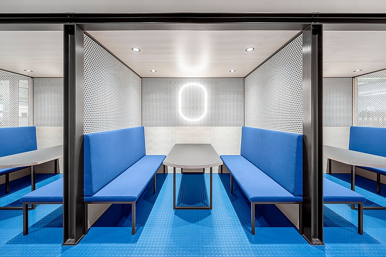 Als Meetingräume fungieren drei geradlinige Kuben, die durch Holz- und genoppter Kautschukoberfläche optische Highlights setzen und akustisch wirksam sind. Kontrastreiche Oberflächenstrukturen treffen hier auf eine klare Linienführung und geometrische Formen. Auch an anderen Stellen sind Möglichkeiten für interaktive Teamarbeit und Kommunikation gegeben: So können sich Mitarbeitende in Sitzkabinen direkt gegenüber den Schließfächern besprechen oder sich im Open Space Bereich gemeinsam in akustisch wirksame Sessel setzen und austauschen.