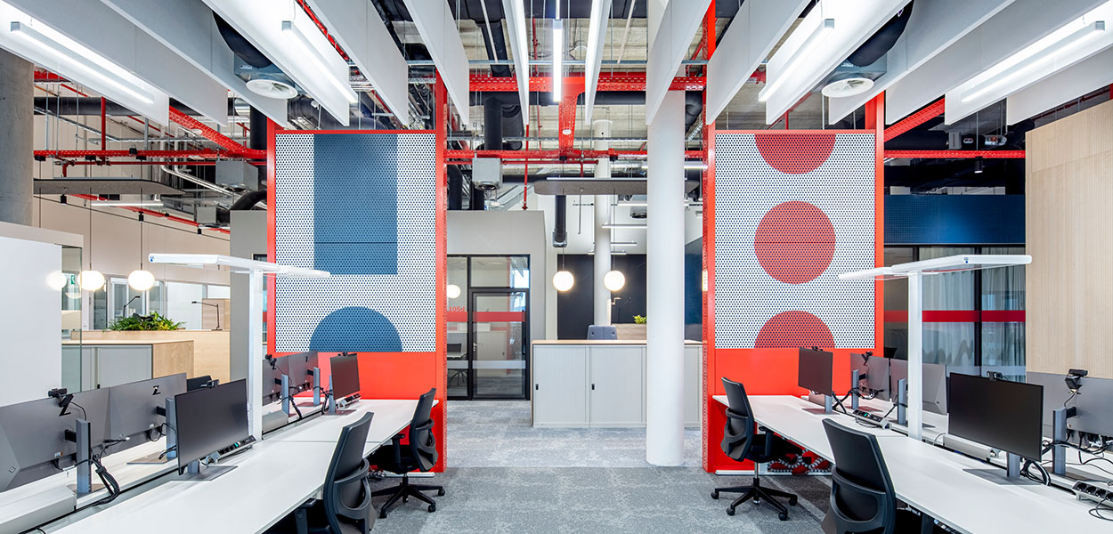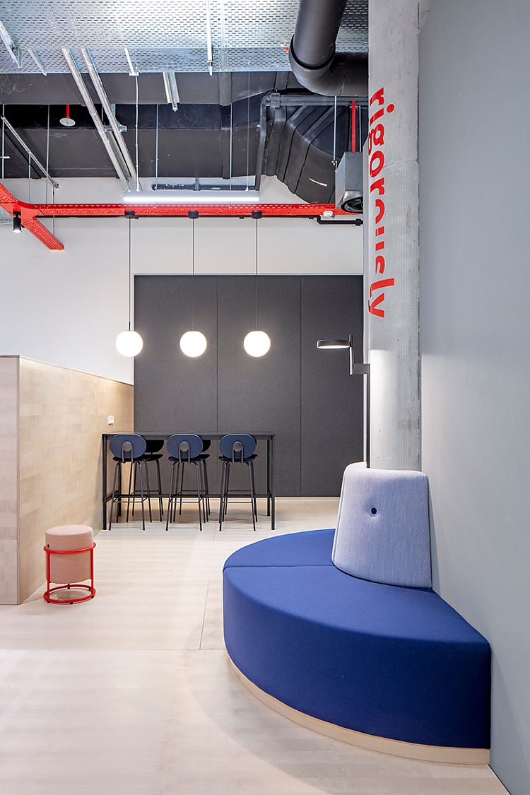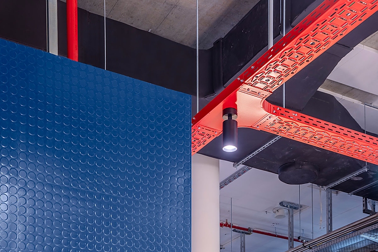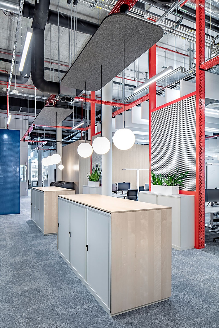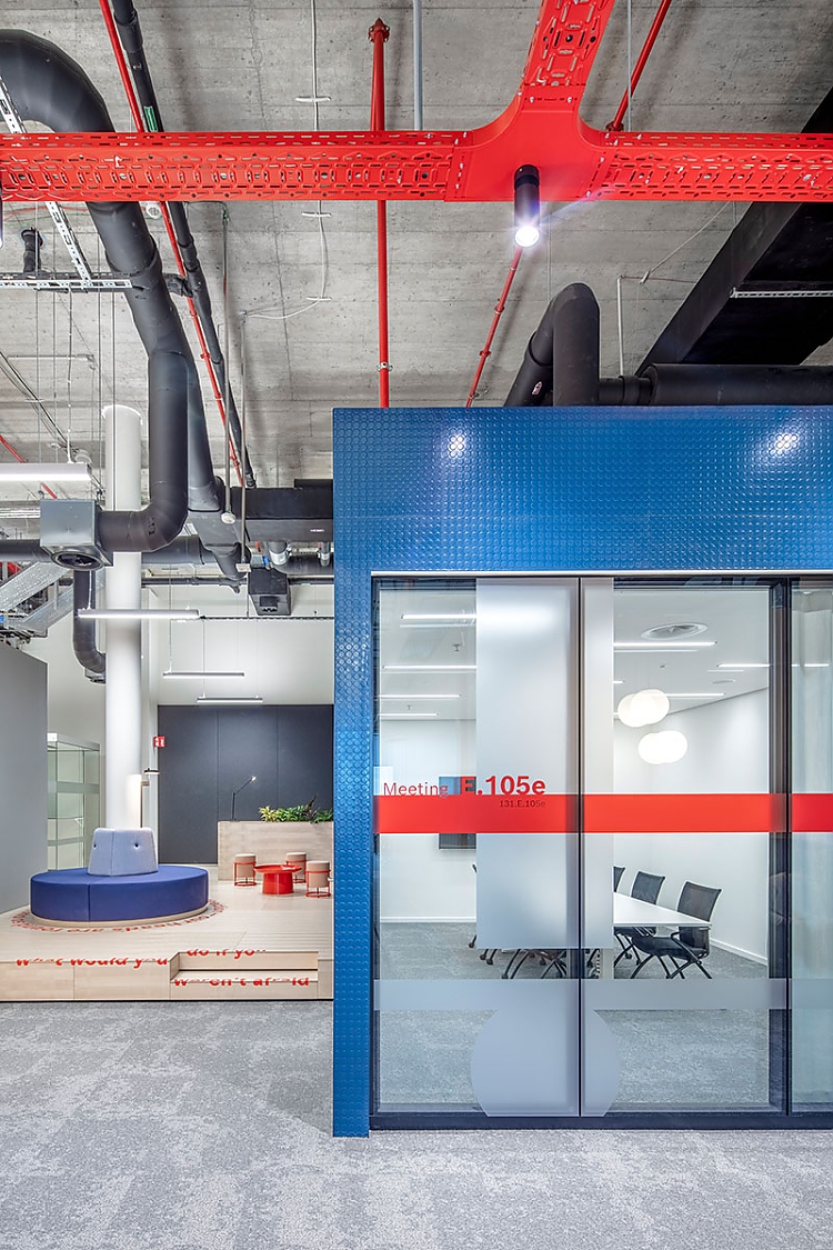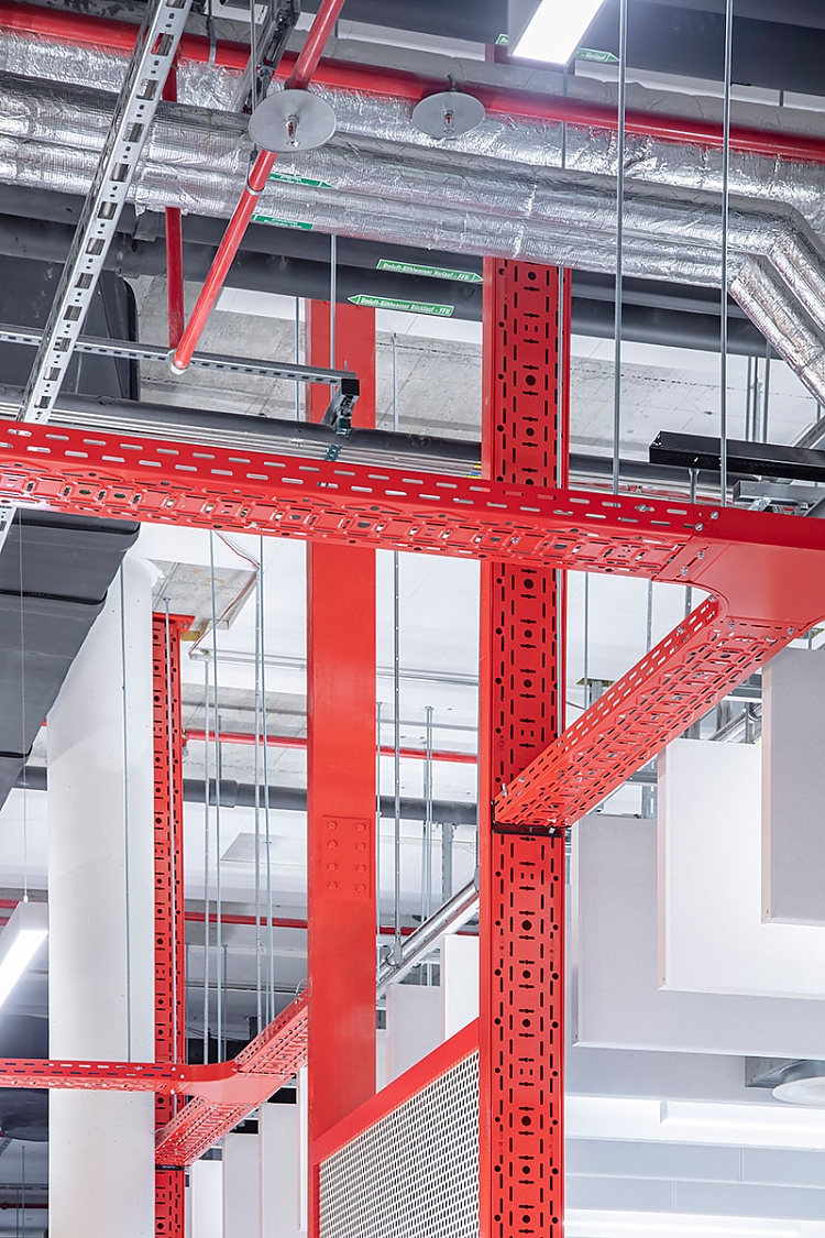 Die charakteristischen Hauptversorgungstrassen wurden gezielt, als wichtiger Bestandteil des ehemaligen Labors, in die Raumgestaltung integriert. In progressivem Rot leiten sie dynamisch durch den gesamten Raum in die "Stations", die als multifunktionale Trennwände im Office-Bereich fungieren: Mit dem Einsatz von Lochblech und schallabsorbierendem Akustikfilz sorgen sie für eine optische und akustische Trennung zwischen den Arbeitsplätzen und sichern gleichzeitig deren Stromversorgung.