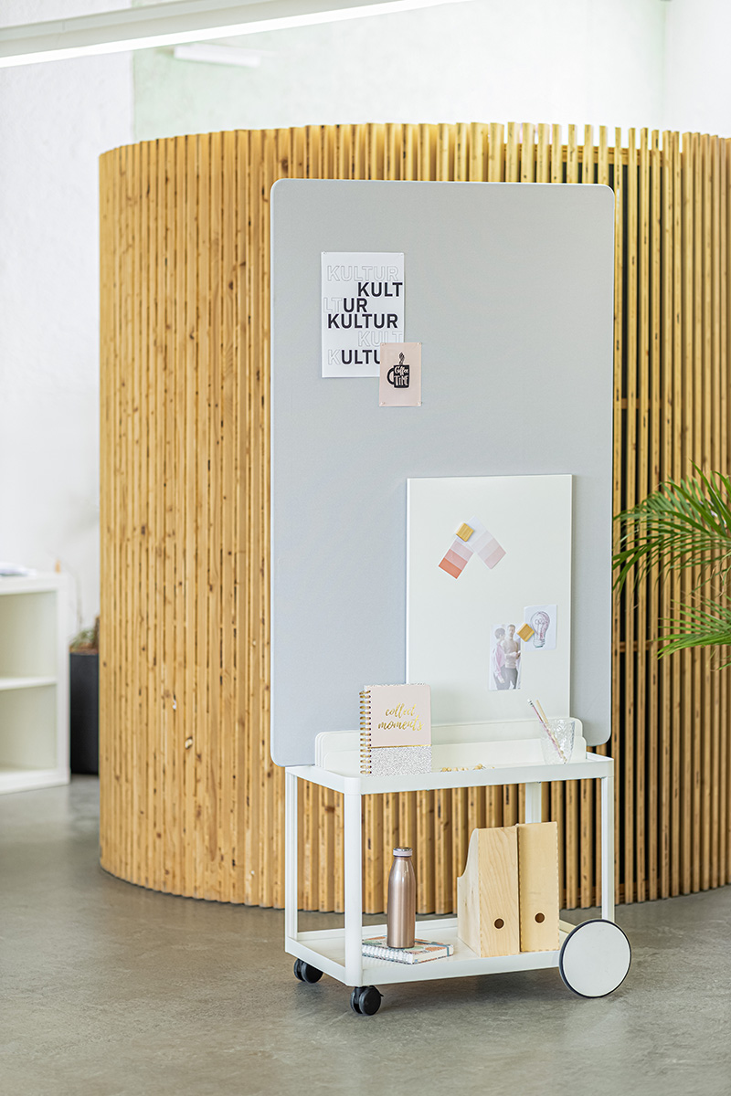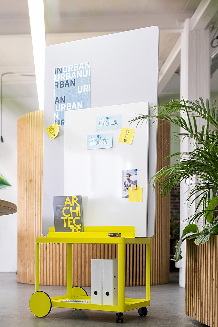 Mit "Mocon" hat das Design-Duo Besau-Marguerre zusammen mit Sigel eine ganzheitliche Lösung für dynamisches Arbeiten geschaffen. Das modulare Board-System bringt Ideen vom Kopf in den Raum, an die Wand oder auf den Schreibtisch. Möglich machen das verschiedene Bases wie "Mobile Stand", "Wall Rail" und "Desk Stand". Wandschiene und Tischhalterung bleiben dabei stationär, während der Rollwagen frei bewegt wird. Unterschiedliche Board-Varianten können als Whiteboard, Akustik-Pinboard oder Acrylglasboard auf den Bases platziert und für die agile Projektarbeit eingesetzt werden. Skizzen, Notizen und Ideen lassen sich nachhaltig festhalten und schaffen eine dauerhafte Visualisierung.