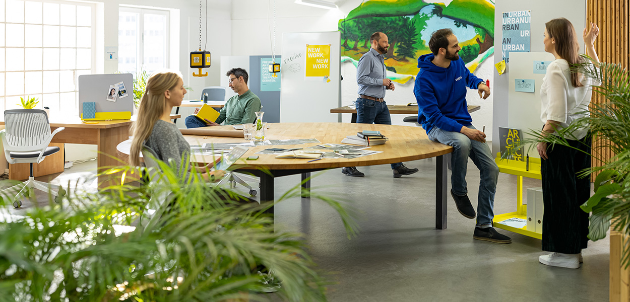 Auch die Schallabsorber "Sound Balance" sorgen im Co-Working-Space des Werk1 für eine angenehme Arbeitsatmosphäre und strukturieren größere Flächen. Sie verbessern dort die akustische Qualität der Räume. Hochwirksame Schallabsorption ist dafür ebenso wichtig wie das Reduzieren der Nachhallzeit im Büro. So kommt kollaboratives und konzentriertes Arbeiten in Balance.