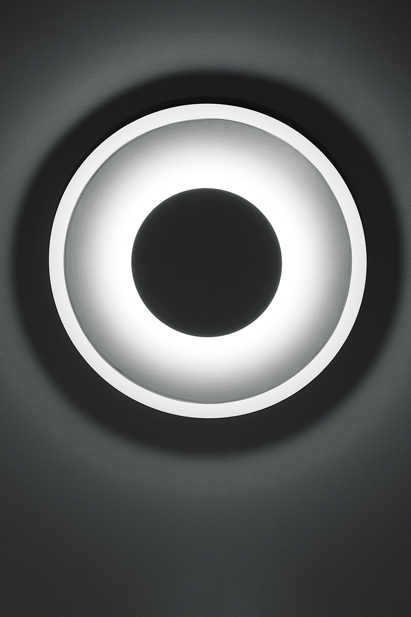 Die Wandleuchte besticht durch einen breiten Rand, der dank seines flachen Winkels besonders viel Licht aufnimmt und so ein fesselndes Spiel mit hellen und dunklen Kreisformen erzeugt. Auf der Light + Building zum ersten Mal gezeigt wird die neue, kompaktere Größe. Die Variante mit einem Durchmesser von 430 mm ergänzt die große Wandleuchte mit einem Durchmesser von 640 mm und eröffnet Gestaltungsmöglichkeiten für zusätzliche Interieurs.