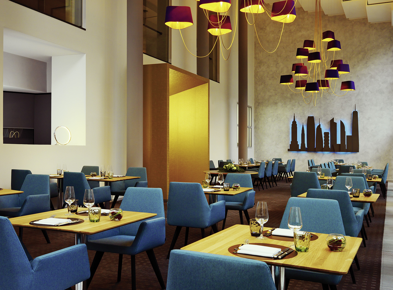 In Zusammenarbeit mit einer befreundeten Innenarchitektin entwickelt Markus Bischof mit Herzblut auch Interior-Design-Konzepte. Bei der Gestaltung des neuen Restaurantbereichs im Hotel Sheraton in Hannover stehen kräftige Farben, elegante Akzente in Gold und ein besonderes Lichtkonzept im Fokus.