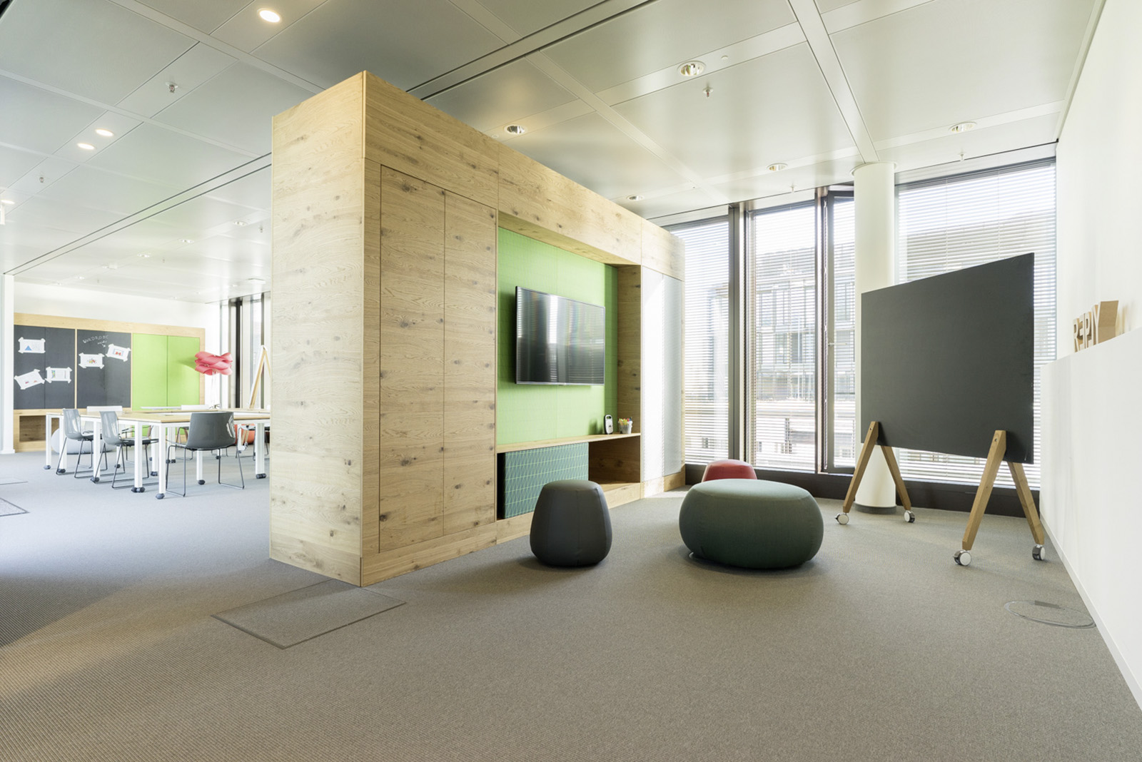 Der Großraum lebt von der Flexibilität und vom Austausch der Mitarbeiter. Dies gelingt ideal, wenn die Mitarbeiter nicht durch stationäre Computer und Schnurtelefone an den Schreibtisch gebunden sind. Ausgestattet mit Laptops und Schnurlostelefonen sind Mitarbeiter im gesamten Büro zu Hause und können flexibel Teams und Arbeitsgruppen bilden. Ein funktionierender Serverzugriff zählt ebenso zur technischen Grundvoraussetzung wie die Ausstattung der Sonderflächen mit Systemen zur Videokonferenz. "Wenn die Technik funktioniert, wird sie auch genutzt."