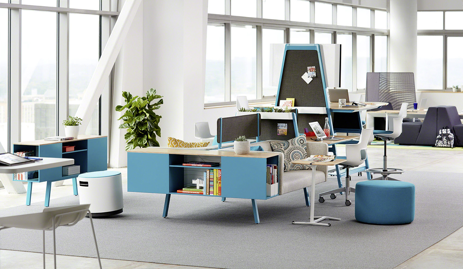 Das System aus modularen Elementen enthält auch ein integrierbares Sofa, das aus "Bivi" einen Loungebereich macht. Fahrrad- und Skateboardhalter verstauen die Transportmittel, mit denen so mancher Arbeitnehmer ins Büro kommt. Ein Baldachin schirmt die Arbeitsplätze akustisch und visuell ab, die nach Wahl mit Ablageflächen, Technologie und integrierbaren Stauraumelementen vervollständigt werden können.