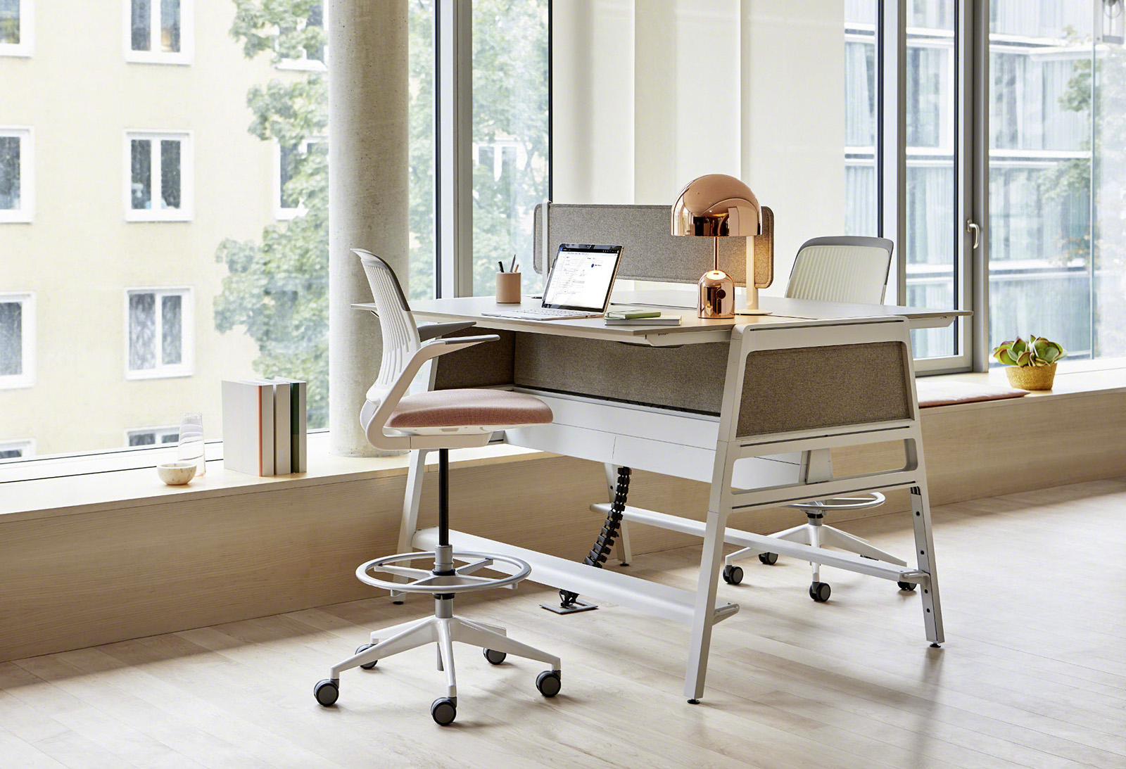 Die Schreibtische in Steh- und Sitzhöhe fördern Bewegung und bieten so einen ergonomischen Arbeitsplatz. Blenden und Aufsatzwände sorgen für die nötige Privatsphäre, wenn konzentriertes Arbeiten gefragt ist. Mit vielen neuen Farb- und Materialoptionen können Unternehmen entweder ein visuelles Statement setzen oder das Tischsystem nahtlos in bestehende Flächen integrieren.