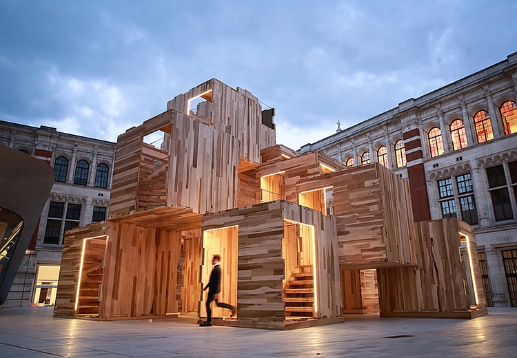 In diesem Jahr haben Waugh Thistleton Architects and Arup mit dem American Hardwood Export Council zusammengearbeitet und "MultiPly", eine interaktive modulare Labyrinth-ähnliche Installation, im "The Sackler Courtyard" des V & A geschaffen.