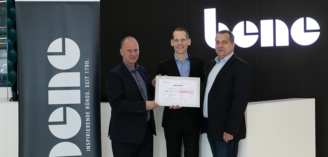 Als eines der führenden Unternehmen dieser Branche stellt sich Bene auch in diesem Bereich seiner Verantwortung. Seit 17. Dezember 2018 ist Bene nunmehr als erstes Unternehmen in Österreich nach ISO 38200 zertifiziert. Diese neue und weltweit gültige internationale Norm legt strenge Anforderungen an eine überwachte Lieferkette (CoC – chain of custody) für Holz und Holzprodukte, Kork und verholzte Materialien und deren Produkte und stellt damit die Rückverfolgbarkeit und Legalität des eingesetzten Holzes sowie eine lückenlose Überwachung der vorgelagerten Lieferkette sicher.