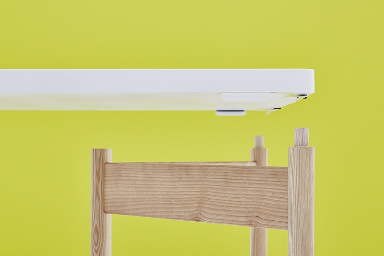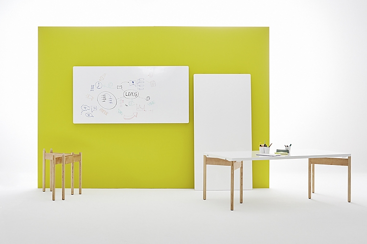 Der "Moving Table" ist ein multifunktionales und praktisches Büro-Tool: Die beschreibbare Leichtbautischplatte, die auf zwei dreibeinigen Untergestellen aus massivem Holz aufliegt, dient gleichzeitig als großflächige Präsentationstafel für die Wand. Der Tisch ergänzt das modulare, in sich geschlossene Office-System von Moving Walls und kann bei Bedarf auch als an die Wand gelehnte Präsentationswand oder mit dem wandmontierte Schienensystem "Moving Rails" verwendet werden. Die clevere Konstruktion des Tisches gewährleistet eine einfache Montage, werkzeuglose Lagerung und macht ihn zum agilen Arbeitswerkzeug, welches die Zusammenarbeit in unterschiedlich großen Gruppen und deren individuelle Arbeitsbedürfnisse fördert.
