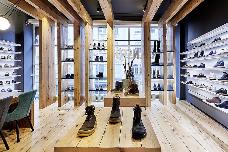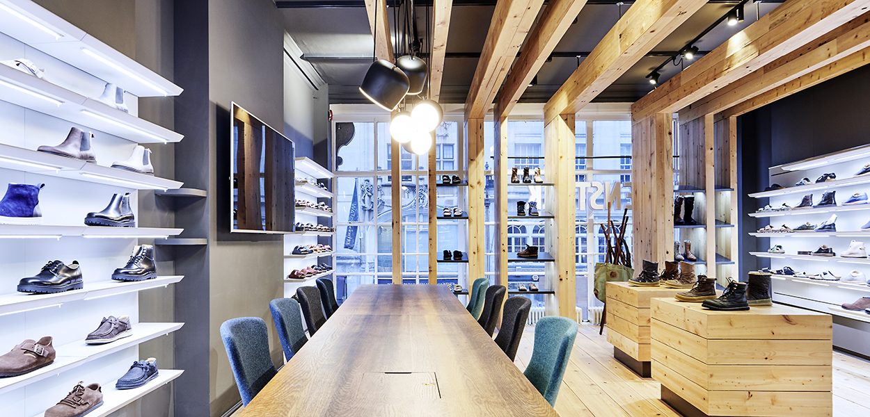 Als Prototyp für die weltweit entstehenden Showrooms von Birkenstock dient der 2017 eröffnete Standort in Tokio, den Brandherm + Krumrey als natürliche und vielfältige Materialwelt konzipierten. Um die Markenphilosophie erfahrbar zu machen, wurde auch der Londoner Showroom in verschiedene Bereiche unterteilt: Im Zentrum befindet sich die so genannte "Workstation" – ein von massiven Eichenbohlen gegliederter Raum-im-Raum, der Platz für Kundengespräche oder informelle Meetings bietet. Ebenso wie die Eichenbalken verleiht auch der Naturholzboden dem Bereich eine natürliche Anmutung, die Bezüge zu einer gesundheitsbewussten Lebensweise herstellt. Unterstützt wird dieser Eindruck noch von dem massiven Besprechungstisch und hölzernen Kuben für die Produktpräsentation. Beleuchtete Regalflächen, die sich von den anthrazitfarbenen Wänden abheben, setzen ebenfalls die Schuhmode in Szene und betonen zugleich die lineare Raumstruktur.