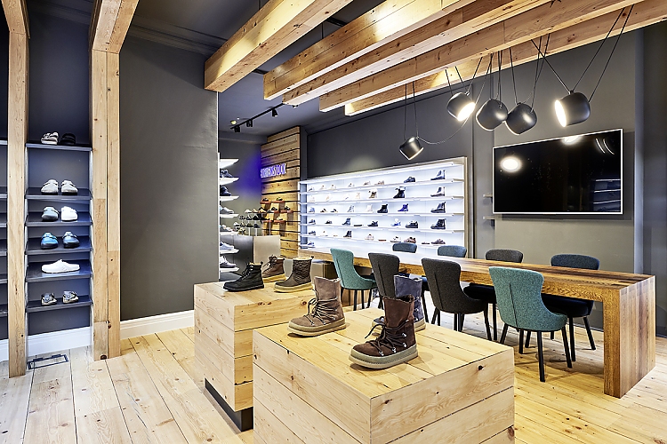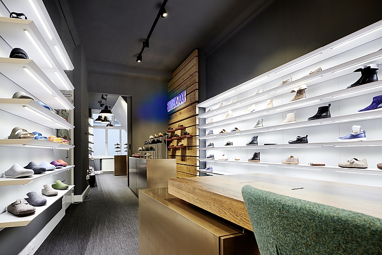 Neben dem eigentlichen Schaubereich befinden sich weitere Präsentationsflächen auf der Altbauetage. Auch hier heben beleuchtete Wandregale die vielfältigen Schuhmodelle hervor und tragen damit maßgeblich zur Raumwirkung und Vermittlung der Produktwelt bei. Typische Materialien für die Schuhe von Birkenstock wie Leder oder Filz setzen gestalterische Akzente. Wie Preziosen werden außerdem die klassischen Sandalen von Birkenstock auf matt glänzenden Kuben mit filigranen Trägerplatten aus Metall inszeniert. Ein individuelles Beleuchtungskonzept sorgt für eine angenehme Lichtstimmung und akzentuiert die zur Schau gestellten Produkte.