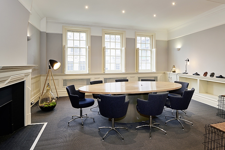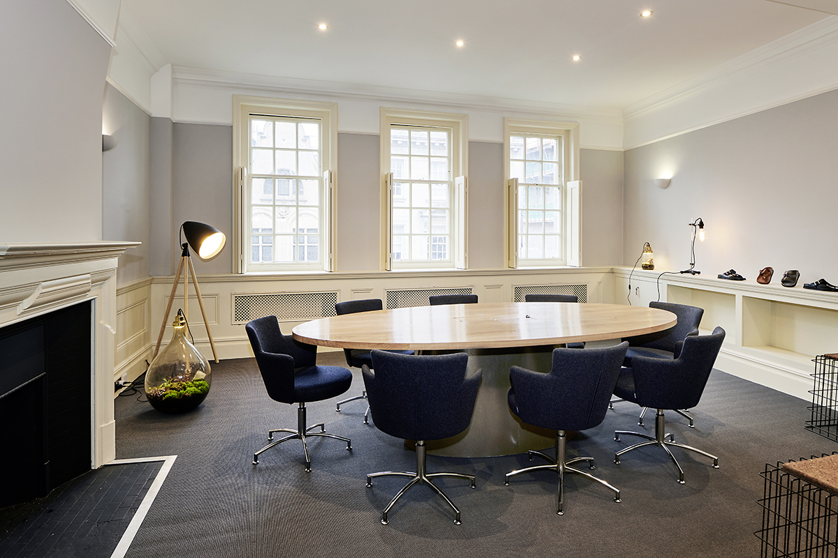 Vom eigentlichen Showroom aus sind die oberen Büro- und Besprechungsräume über das historische Treppenhaus zu erreichen. Der viktorianische Raumzuschnitt wurde hier ebenso erhalten wie zwei historische Kamine, was den Arbeitsbereichen ein authentisches Ambiente verleiht. Ausgewähltes Möbeldesign und wenige dekorative Elemente prägen die hochwertige und dennoch entspannte Atmosphäre.
