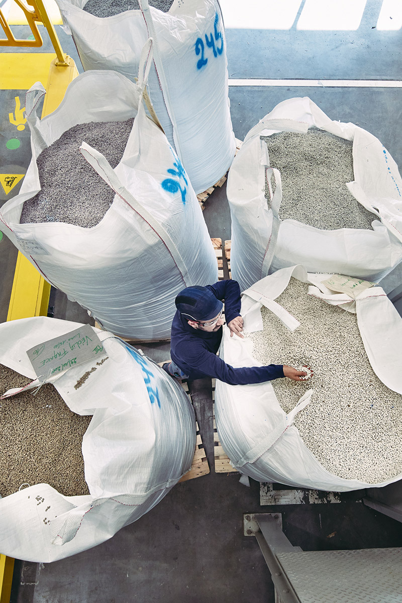 Die oben genannte Pilotanlage zur Reinigung wurde neben elastischem Bodenbelag auch schon mit gebrauchten homogenen Böden aus Deutschland "gefüttert". Denn wir haben ein paar große Unternehmen als Kunden, die die Rücknahme und garantierte Wiederverwertung zur Kaufbedingung für Neuware im Bereich homogener Bodenbeläge machen. Hier zahlen sich die Investitionen und bereits gemachten Erfahrungen von Tarkett aus.