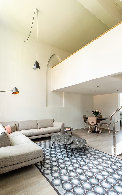 Ausgewählte Wohnaccessoires runden das Gesamtbild ab. Wer genauer hinschaut, erkennt auch hier die feine Handschrift von Claire Vos, fokussiert auf Materialität im Einklang und ein ruhiges Farbenspiel mit dezenten Farbtupfern. So wie bei dem Kissen "Abstract" oder dem Teppich "Punto". Ergänzend zum ganzheitlichen Lichtkonzept setzen Stehleuchten – wie "Uturn", "Pom" oder "Pylaz" – helle Akzente im Wohnraum. Alle Accessoires stammen aus der Pode Kollektion und komplementieren das Leolux-LX-Projekt Ingenhousz.