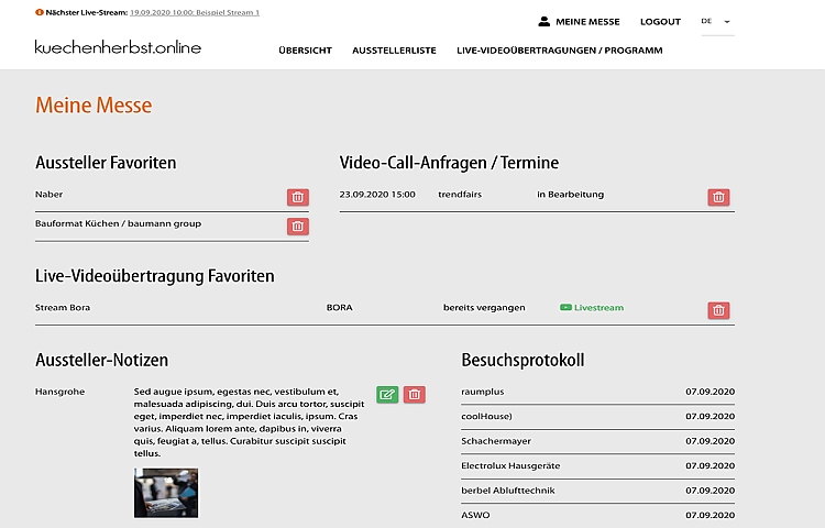 Das wichtigste Handwerkzeug jedes registrierten Nutzers ist die hinterlegte Funktion "Meine Messe" – ein individuelles Logbuch und Protokoll für den eigenen Messeaufenthalt, welches nur der Besucher selbst sehen kann. Via E-Mail lassen sich Anfragen stellen, digitale Notizen zu den Ausstellern hinterlegen und nachsehen, welche Aussteller schon besucht worden sind.