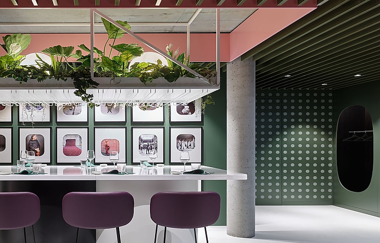 Dieser Idee folgend ist das Campus-Restaurant in drei Abschnitte gegliedert: Die Lounge, den Essbereich und die Vinothek. Die offen gestaltete Theke hebt die Trennung zwischen Gast und Personal auf und holt den Charme einer Küche an die Bar. Das Fenster in die Küche eröffnet dem Gast eine visuelle Verbindung zum Koch.