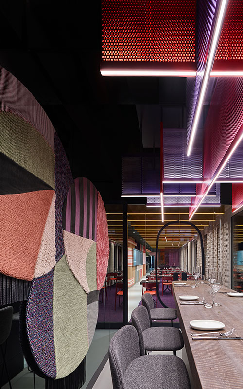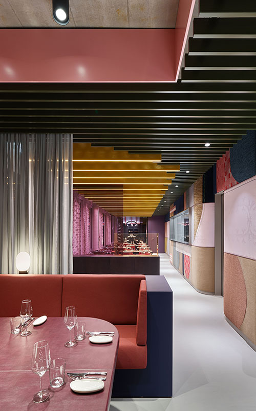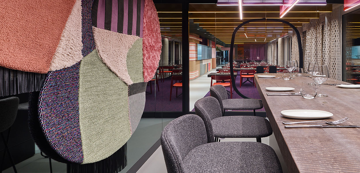 Die dynamische Farbgebung des Restaurants sticht sofort ins Auge: Durch das Spiel mit hochwertigen Textilien und Farben entsteht ein taktiles Raumerlebnis. Im Essbereich wartet ein atmosphärisches Abenteuer aus Düften, Klängen, Geschmack – und natürlich Farben und Stoffen. Hier galt es, die Einrichtungskompetenz von Object Carpet erlebbar zu machen – unaufdringlich, aber greifbar. So gehen textile Collagen an der Wand aus Damast und Sackleinen in einen Dialog mit Teppich und Cord. Wesentliches Gestaltungselement sind die Teppiche der neuen Kollektion "Object Carpet x Ippolito Fleitz Group".