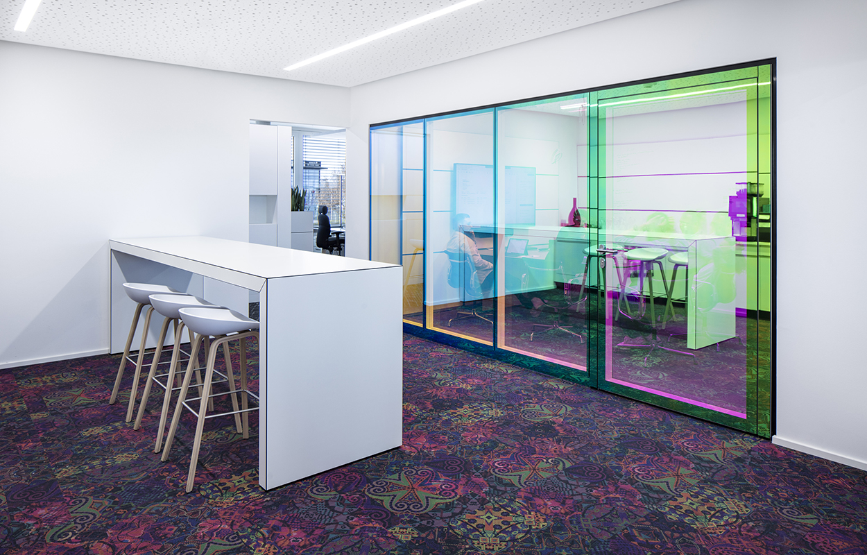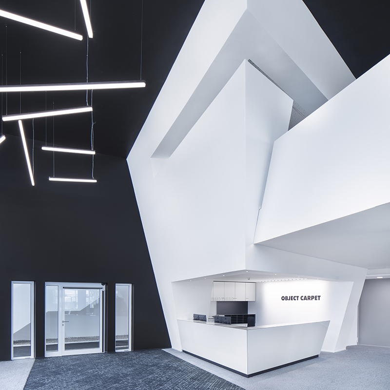 Im Showroom können sowohl die textilen Bodenbeläge von Object Carpet als auch ganzheitliche Planungen und Konzepte dank VR-Technik und 3D-Brillen in virtuellen Räumen und Gebäuden betrachtet werden. Dabei sind die vielfältigen Designs, Farbstellungen und Qualitäten natürlich auch haptisch zu erleben. "Die hohen Ansprüche an Qualität, Gesundheit und Ökologie, die unseren Produkten zugrunde liegen, haben wir auch an den Neubau gestellt," erklärt der Firmengründer. „Was wir unseren Kunden verkaufen und was wir promoten, nämlich zukunftsweisende Formen der Zusammenarbeit, das soll hier auch gelebt werden."