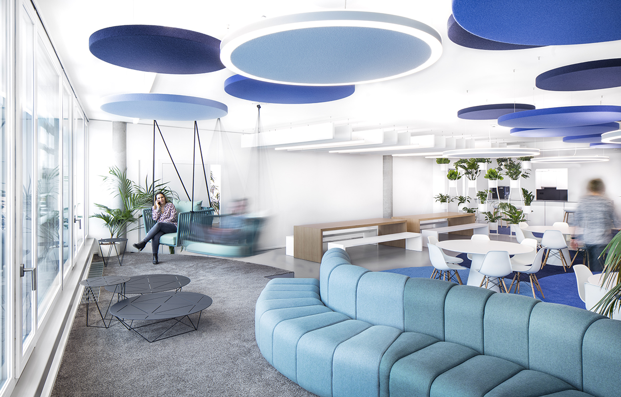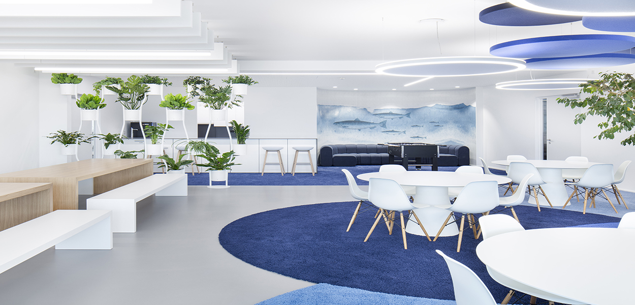 Gestaltet sind die Kommunikationsräume nach Themenwelten wie "Jungle" oder "Aquarium". Dieser in inspirierenden und zugleich klaren Blautönen gestalteter Bereich kann für Präsentationen, Pausen, mobiles Arbeiten und Netzwerken genutzt werden. "Kommunikation und Kooperation stehen bei der Gestaltung der Büroräume im Mittelpunkt. Und da Arbeitsweisen und Platzbedarf ständig im Wandel sind, sollten sie sich den jeweiligen Ansprüchen anpassen und so eine Office-Wohlfühllandschaft bilden."
