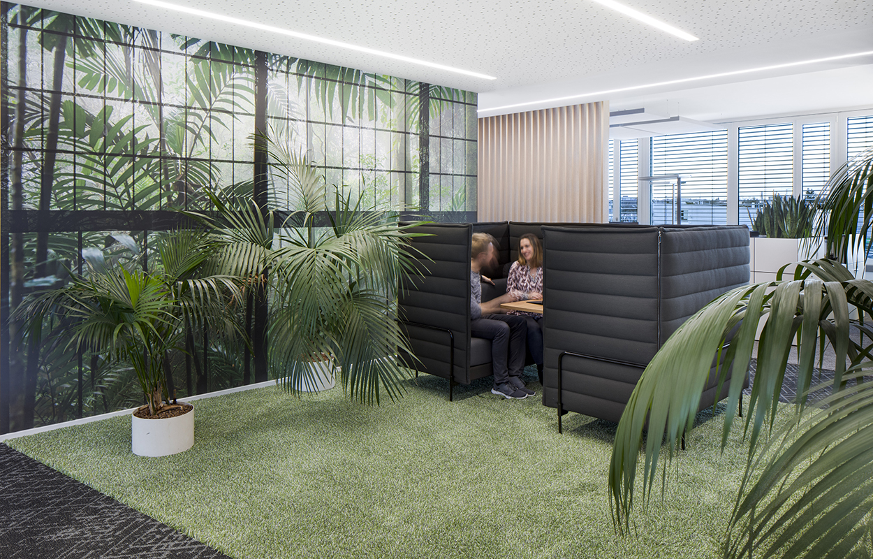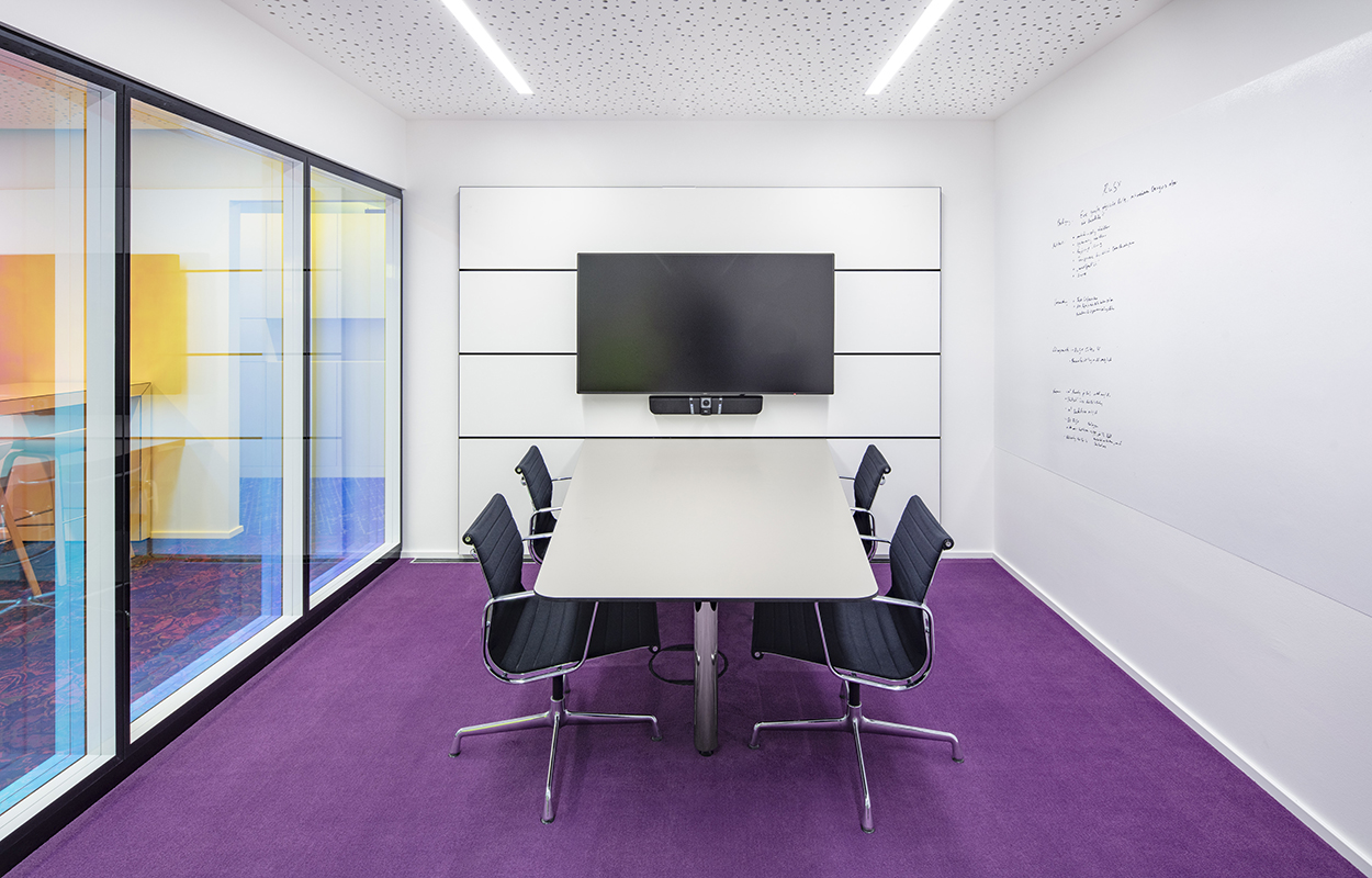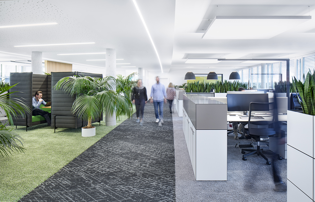 Nur wenige klassische Einzelbüros und Besprechungsräume finden sich unter den bis zu 3,2 Meter hohen Decken, stattdessen gibt es Open Space- und New Work-Arbeitsplätze, Kommunikations- und Rückzugsbereiche. Flure sind als offene Bereiche konzipiert und geben den Mitarbeitern, abgeschirmt von großen Grünpflanzen und auf Alkoven-Sofas, Gelegenheit zum Gespräch oder zur kurzen Auszeit.