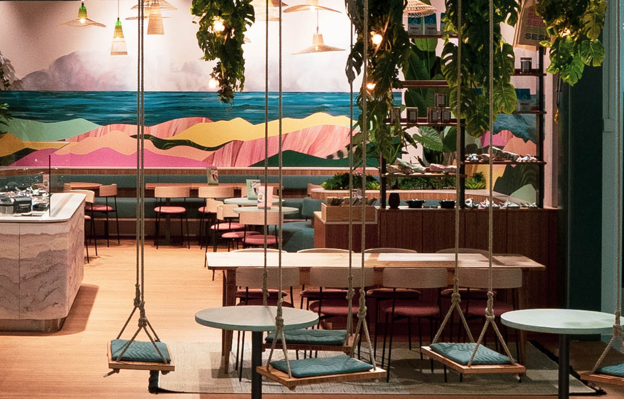 Das neue Restaurantkonzept der SV Group richtet sich an Menschen, die mit Begeisterung Neues entdecken, gern ausgewogen und bewusst essen und sich in einer modernen, verspielten Umgebung wohlfühlen. "Seshhhh". Schon der Name der Kette, für die später weitere Standorte folgen sollen, spielt mit Assoziationen und Lautmalerei: "Sesh" ist ein Kunstwort und dem Geräusch einer Welle nachempfunden, die sich langsam aufbaut und dann am Strand aufschlägt und bricht.