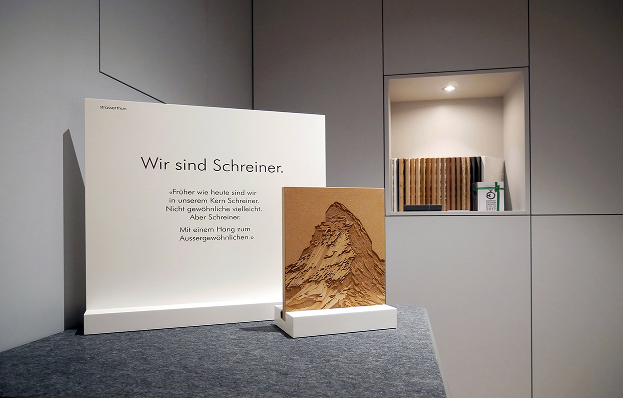 "Sublidot by Strasserthun" nennt das Unternehmen das Veredelungsverfahren, das via Lasersublimation Massivholz, Furnier und andere organische Oberflächen materialschonend "beschreibt". Jüngstes Beispiel war das Felsrelief des Matterhorns mit seinen rauen und scharfkantigen Flanken, für dessen Neuinterpretation der Street-Art-Künstler Ata Bozaci sich der Lasertechnik bediente. "Wir wählten einen unverkennbaren grafischen Stil", erklärt der Künstler, "umgesetzt mit einer in der Schreinerwelt noch nie dagewesenen Technologie."
