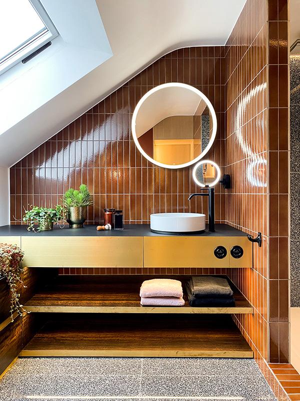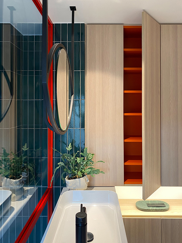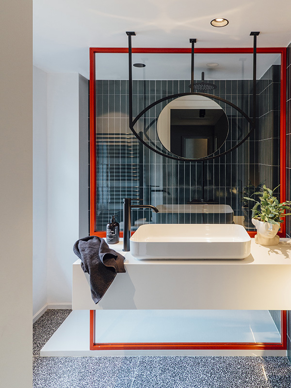 Wir haben im Elternbadezimmer die Serie in der Farbe Goldgelb geflammt eingesetzt, in Kombination mit schwarzen Armaturen, Accessoires und einem schwarz-weißen Bodenbelag. Auf diese Weise gelang eine perfekte Balance zwischen zeitgenössischem Design und Vintage-Feeling. Für das Kinderbadezimmer sahen wir die Farbe Blaugrün geflammt vor – wegen ihrer frischen, lebendigen Anmutung. Den Rahmen der Duschtrennwand haben wir in Rot streichen lassen und damit bewusst einen Kontrast geschaffen. Der Spiegel in Form eines Auges ist eine Maßanfertigung und bringt augenzwinkernd eine spielerische Note in den Entwurf.